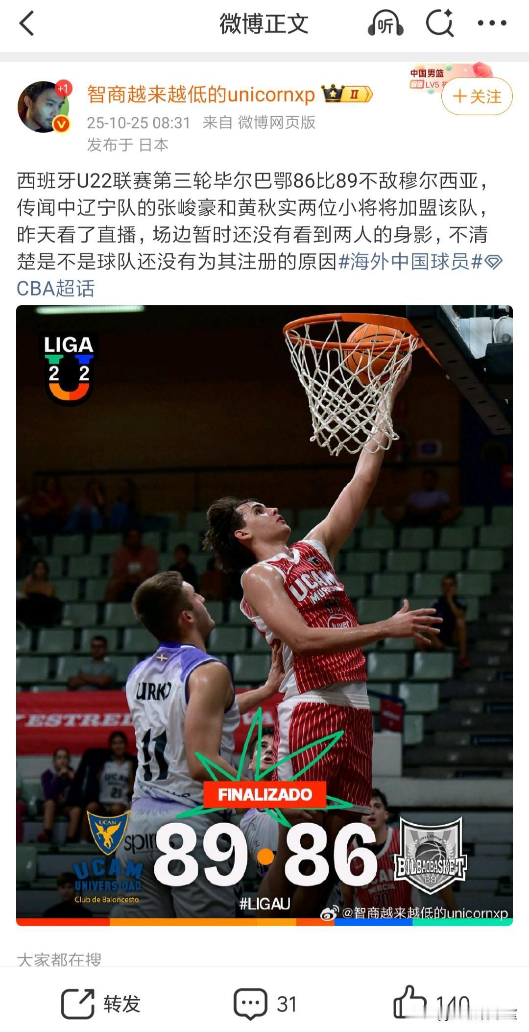 篮球选秀专家王健:西班牙U22联赛已经打了三轮,但是辽宁两小将张峻豪和黄秋实并没有出现在毕尔巴鄂队的比赛大名单里,不知道是不是没有注册的原因? 在我看来,张峻豪和黄秋实加盟西甲华尔巴鄂应该不会是假的,毕竟辽篮俱乐部都已经官宣了,至于没有出现在球队的比赛大名单里,我认为除了毕尔巴鄂还没有为他俩注册的可能原因外,还有可能是他俩刚到西班牙不久需要倒时差,另外是他俩刚加盟球队还需要磨合,毕竟赛程还长,不着急,相信再过几轮,他俩就可以代表毕尔巴鄂参加比赛了