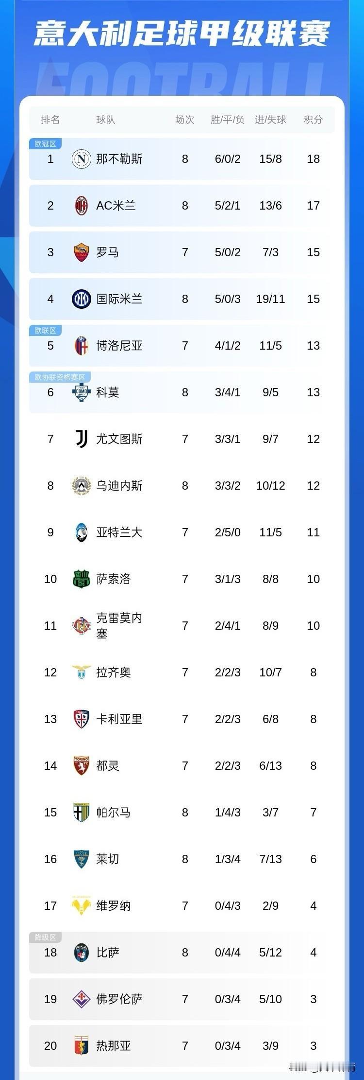 意甲最新积分榜:那不勒斯3:1终结国际米兰4连胜重登榜首,德布劳内点射破门可惜伤退,小因扎吉离开后国米在意甲赛场也就失去了优势;亚特兰大1:1战平克雷莫内塞,亚特兰大控球率65%和射门20次还是难以战胜升班马,各项赛事取得4连平。本赛季意甲属于群雄逐鹿,国际米兰、AC米兰、那不勒斯、尤文图斯和罗马等球队,均是冠军的争夺者。