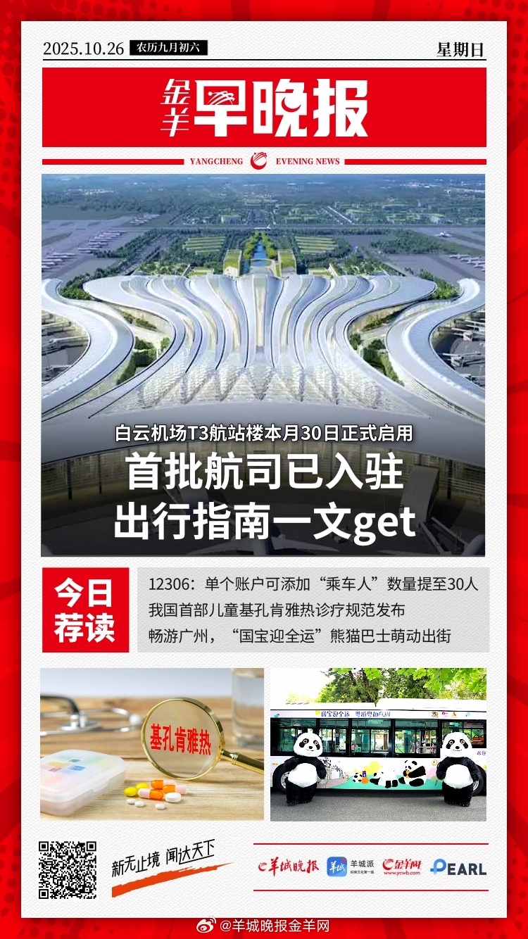 #金羊早晚报# 首批航司入驻!一文get白云机场T3出行指南;国内首部!《儿童基孔肯雅热诊治专家建议(2025)》发布;十五运会会歌《气势如虹》粤语版监制崔轼玄:粤语版本有侠气;12306优化服务:单个账户可添加“乘车人”数量提至30人;量贩零食店为何遍地开花?又是怎样实现盈利的?考古新发现!山西公布5座元代平民墓葬遗物;江西鄱阳警方:11岁男孩在校外遭多人殴打,全部涉案人员被抓获;山海“骑”遇大湾区!骑行生活圈辐射大湾区,催生“骑行经济”新热点;广东省内多条高铁项目进度刷新!珠肇高铁、深汕高铁建设迎来新突破;畅游广州,“国宝迎全运”熊猫巴士萌动出街;随队获个人常规赛首胜,杨瀚森在防守端进步明显;绑架中国公民的3名嫌犯被南非警方击毙;美国派航母赴拉美,多国强烈谴责;美财政部宣布对哥伦比亚总统等人进行制裁。#光复二字遍及台湾大街小巷##俄罗斯发动大规模夜袭##江西一公安局副局长为黑恶势力站台##专家怀疑太阳系星际访客系航天器# 更多精彩报道,请扫码关注羊晚全媒体报道!