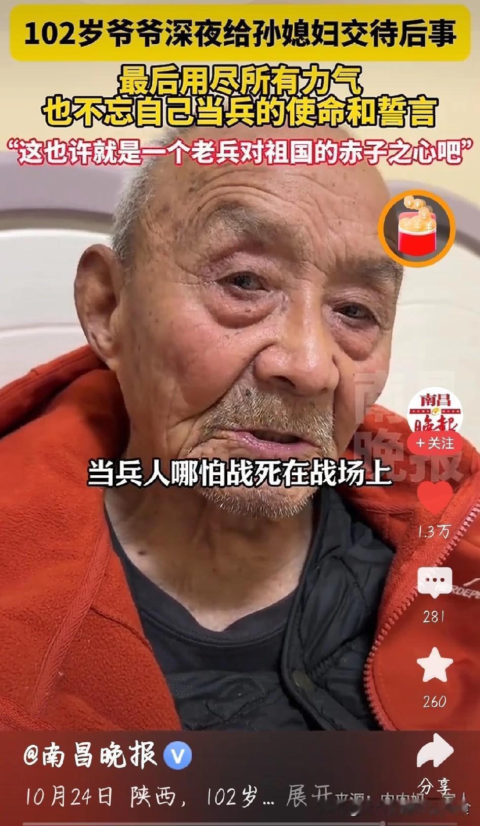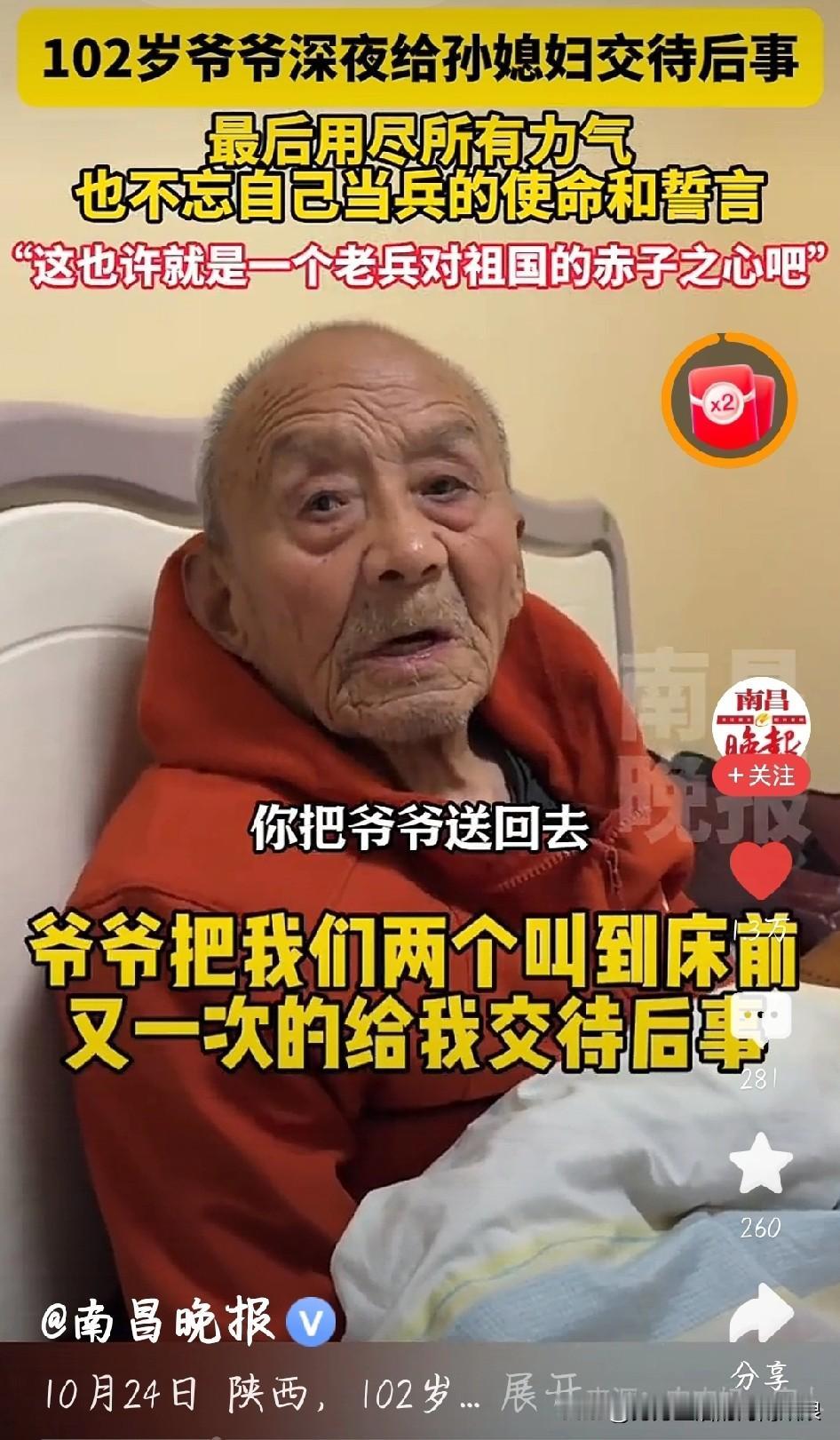 陕西102岁爷爷深夜敲门,后事全是牵挂 凌晨十二点,陕西102岁的爷爷摇着轮椅敲开孙媳妇房门,声音发颤:“爷可能不行了,得交代后事。” 他就说三件事:死后要跟老伴合葬,得孙媳妇看着下葬立碑;记挂着车祸去世的大女儿,肇事司机跑了,这是他一辈子的心结;怕重孙女内向受气,要把老家房子留给她,还让招上门女婿。 孙媳妇没哭,翻出“光荣之家”牌匾:“您当过兵,优待证还有俩月到,得等着!”爷爷摸着牌子红了眼,立马说“我撑着”。 百岁老人的后事,全是对家人的惦念。这一幕,看哭多少人。陕西102岁爷爷深夜给孙媳妇交待后事 102岁爷爷深夜给孙媳妇交待后事 图片截图于南昌晚报