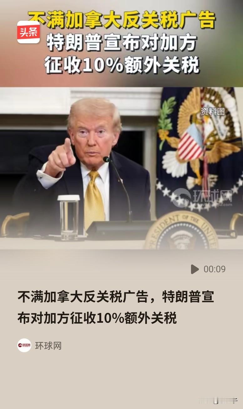特朗普疯了,逮谁怼谁,连盟友加拿大也不放过,加征10%关税,只是因为一条广告,这