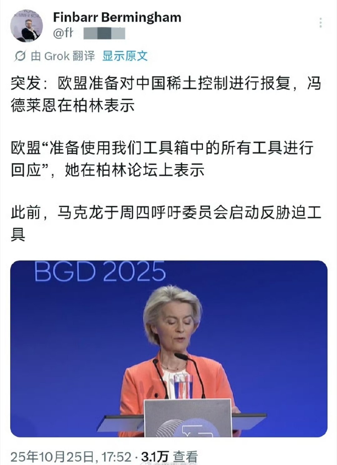 据路透社报道,周六在德国柏林欧盟委员会主席冯德莱恩在谈及中国稀土出口管制措施时表示,欧方“正致力于与中方共同寻求解决方案”。但紧接着,她强硬威胁称,布鲁塞尔正在考虑采取一切措施以应对中方措施。