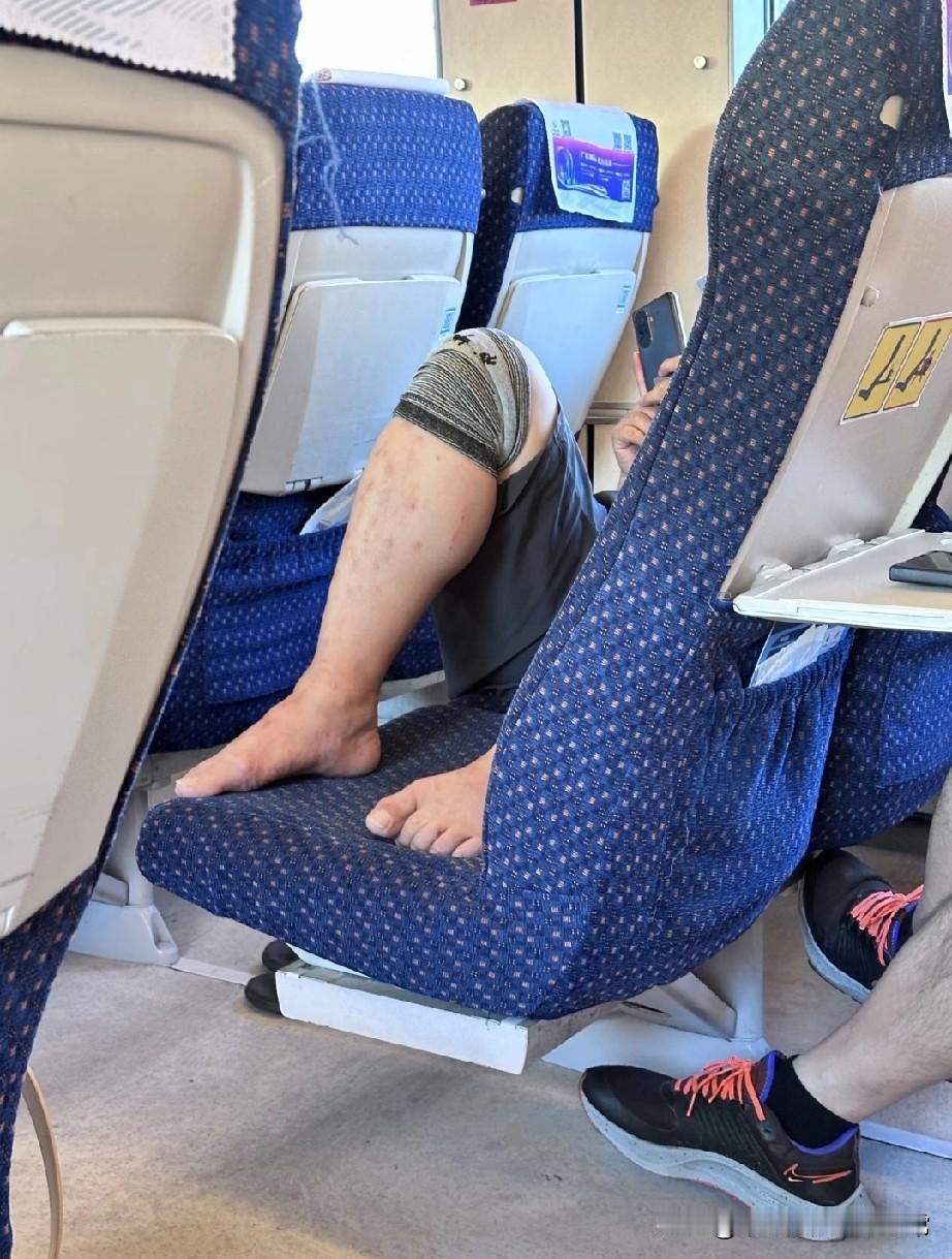 再也不敢穿短裤坐高铁了,好可怕的双脚。 坐高铁遇到有人光脚踩座位,那画面简直绝绝子——脚丫子直接霸占座椅,咱穿短裤的看了都怕沾到“隐形细菌”,鸡皮疙瘩掉一地! 公共交通不是自家客厅啊喂!这波操作是把素质按在地上摩擦吧?真想问一句:您这是把高铁座椅当“足底按摩垫”了吗? 要是都这么放飞自我,以后谁还敢安心坐车?你觉得这种行为该当场制止吗?
