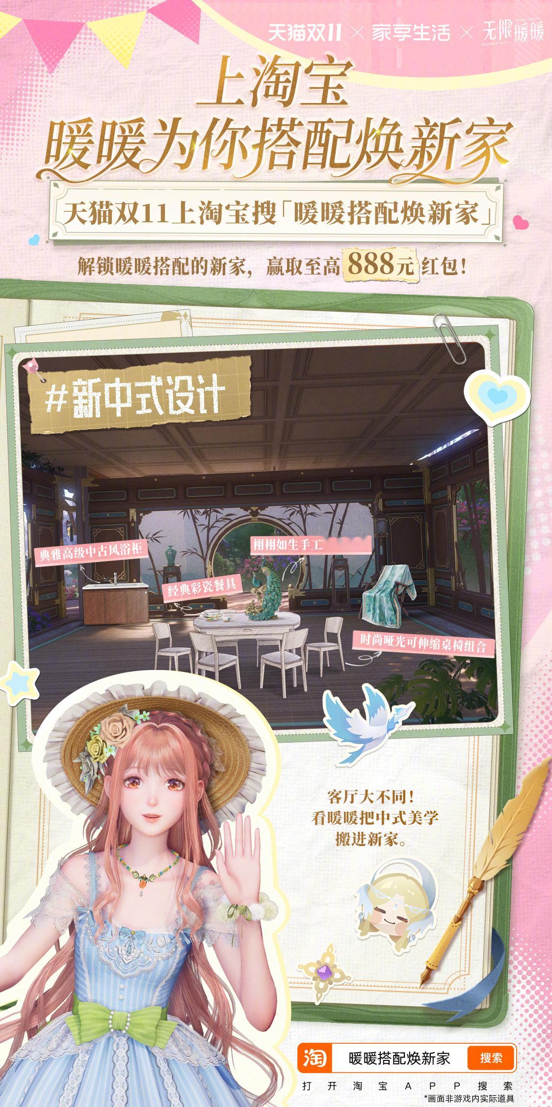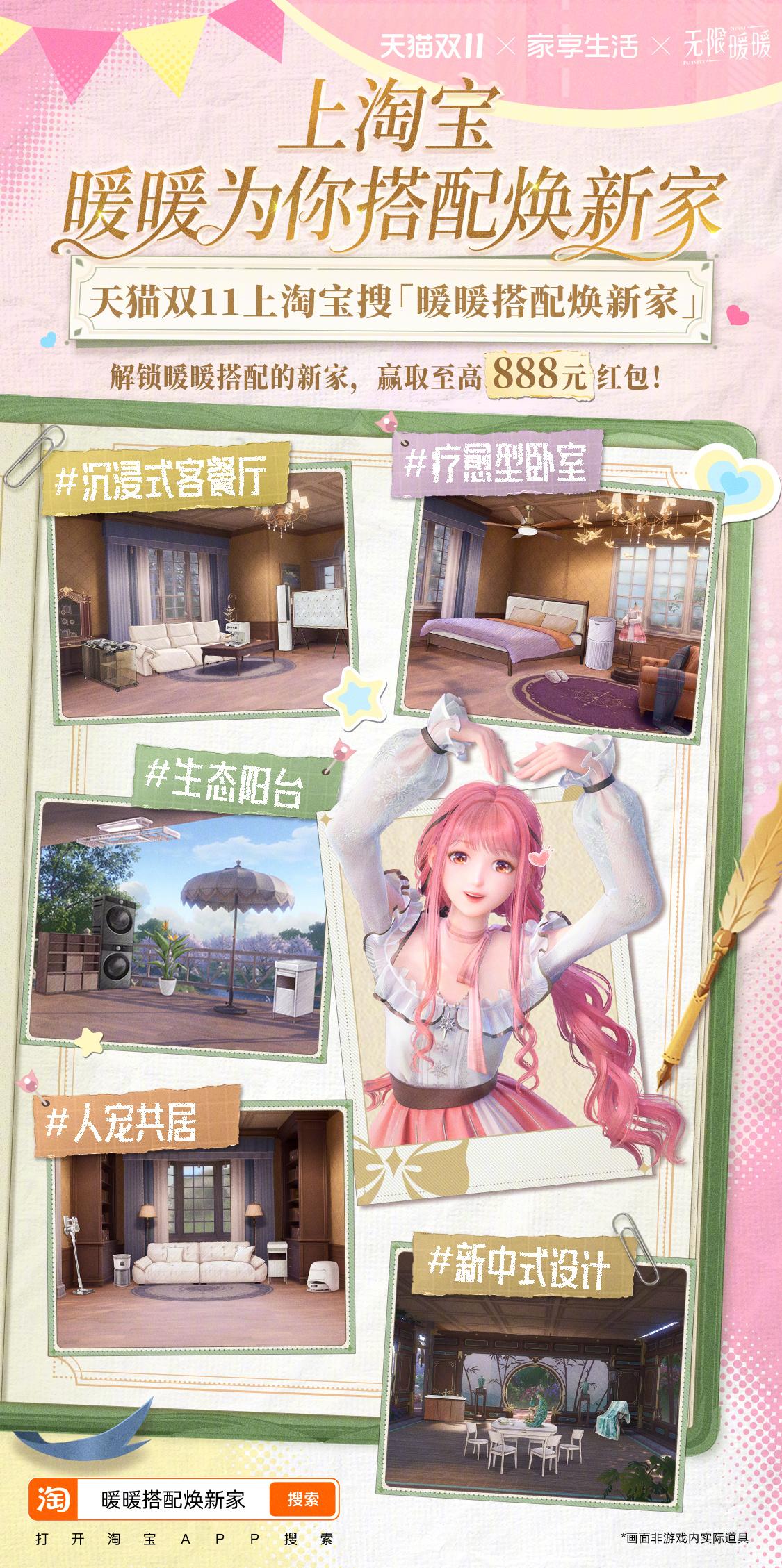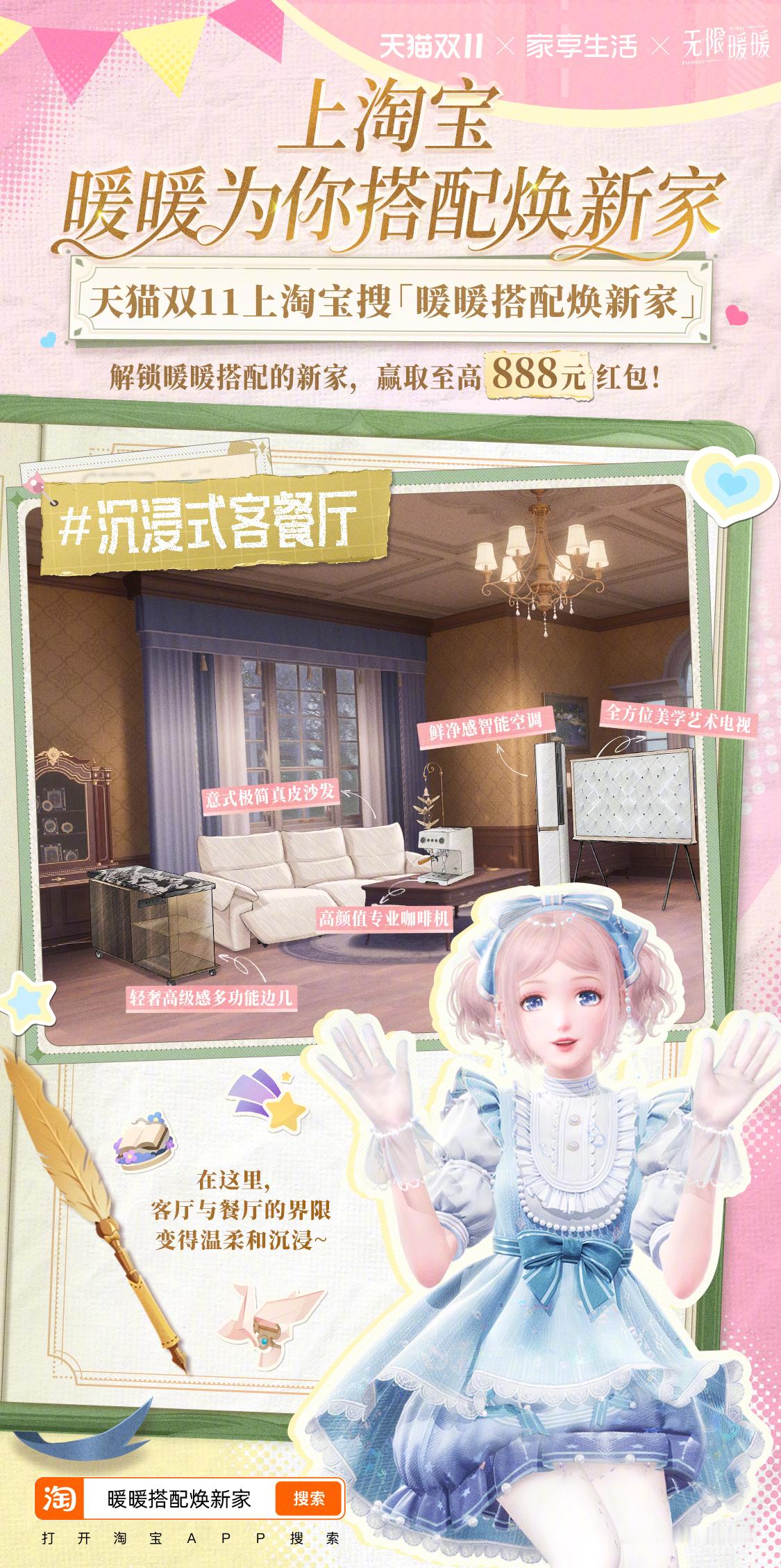 快来参与天猫与无限暖暖的跨界合作!打开淘宝搜索【暖暖搭配焕新家】,即可沉浸式体验游戏场景,收集5个素材即可抽奖,赢取888元红包、88VIP皮肤及游戏道具。线下打卡暖暖与天猫主题城市大屏,线上还能体验暖暖帮你搭配新家的趣味玩法!更多惊喜,尽在天猫平台与线下打卡点,一起探索吧!天猫无限暖暖