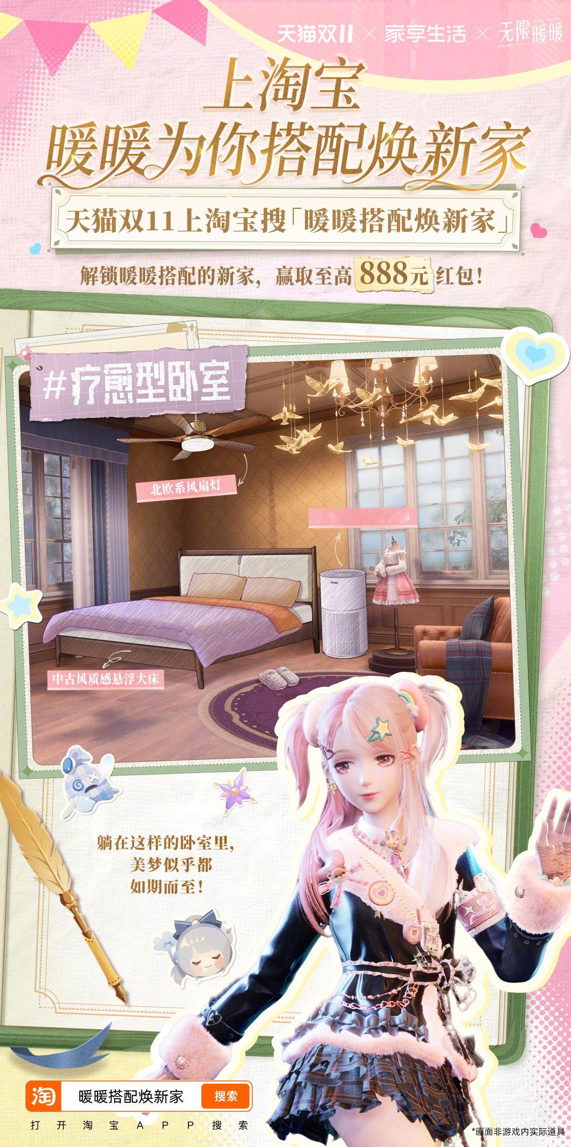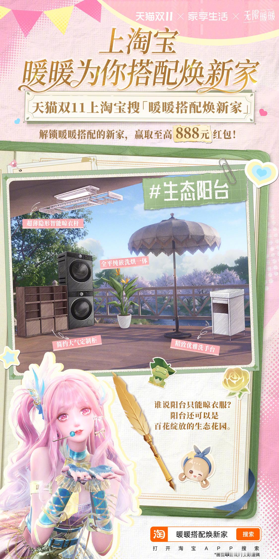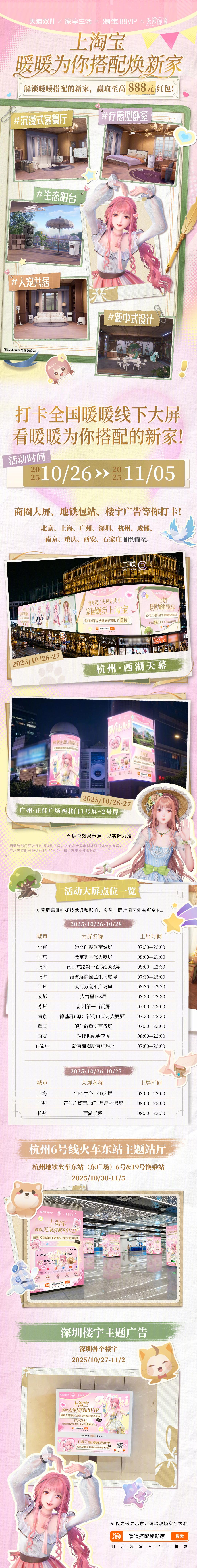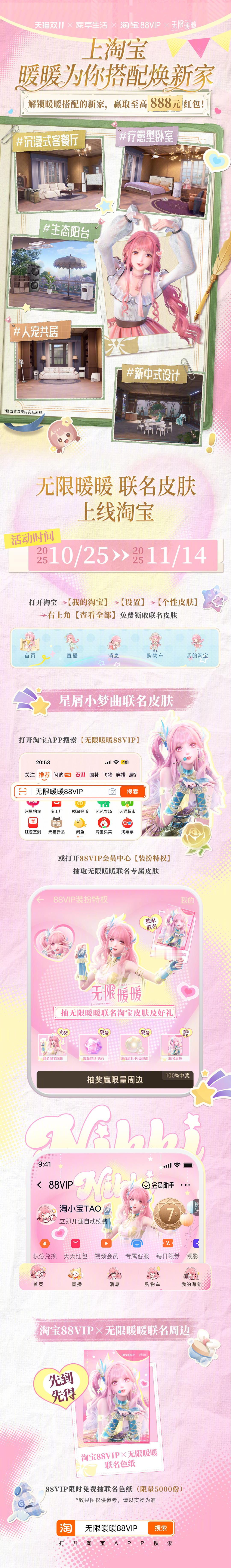 快来参与天猫与无限暖暖的跨界合作!打开淘宝搜索【暖暖搭配焕新家】,即可沉浸式体验游戏场景,收集5个素材即可抽奖,赢取888元红包、88VIP皮肤及游戏道具。线下打卡暖暖与天猫主题城市大屏,线上还能体验暖暖帮你搭配新家的趣味玩法!更多惊喜,尽在天猫平台与线下打卡点,一起探索吧!天猫无限暖暖
