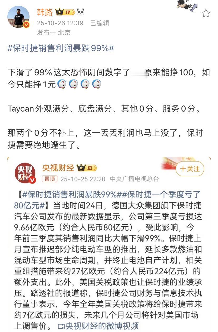 韩路:保时捷销售利润暴跌99%,下滑了99%这太恐怖阴间数字了,原来能挣100,如今只能挣1元! 保时捷的利润下滑是肯定的,主要还是保时捷没有办法提供给消费者更好的选择,特别是在中国市场新能源发展这么快,但是保时捷的产品相对来说还是比较一般的。 特别是在新能源时代保时捷推出的产品,可以说并不是那么优秀,因为可替代的实在是太多了。
