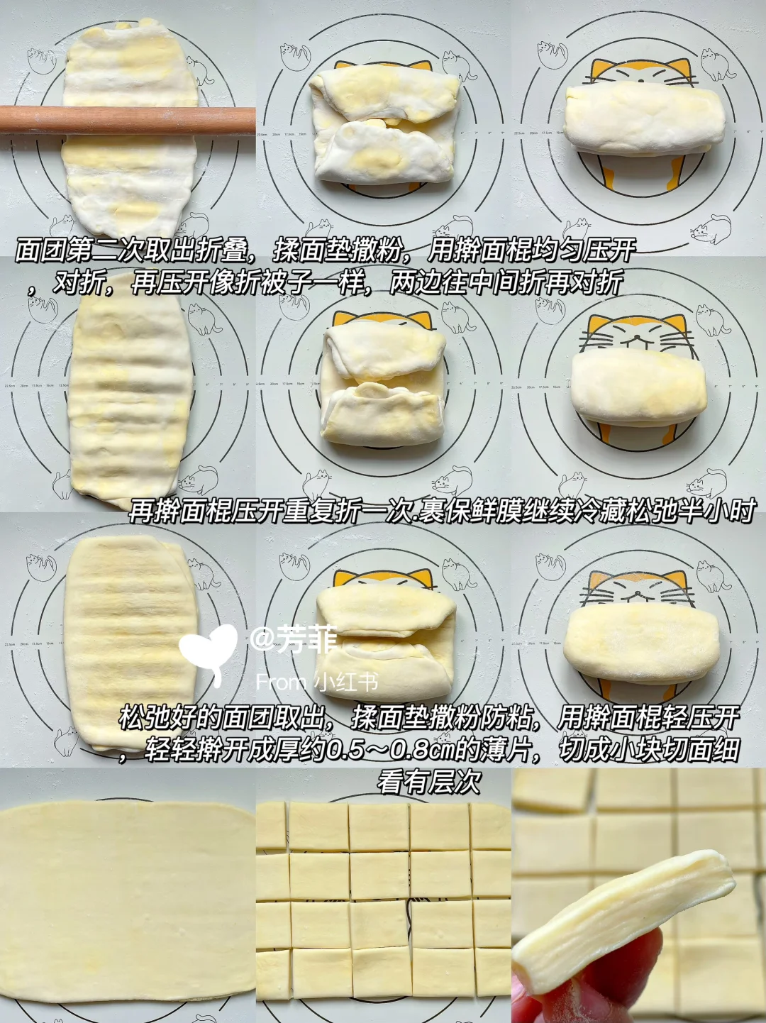 4️⃣最后面团取出,揉面垫撒粉防粘,用擀面棍轻压开擀开成厚约0.5~0.8㎝的薄片,切成小块,切面能看到层次
