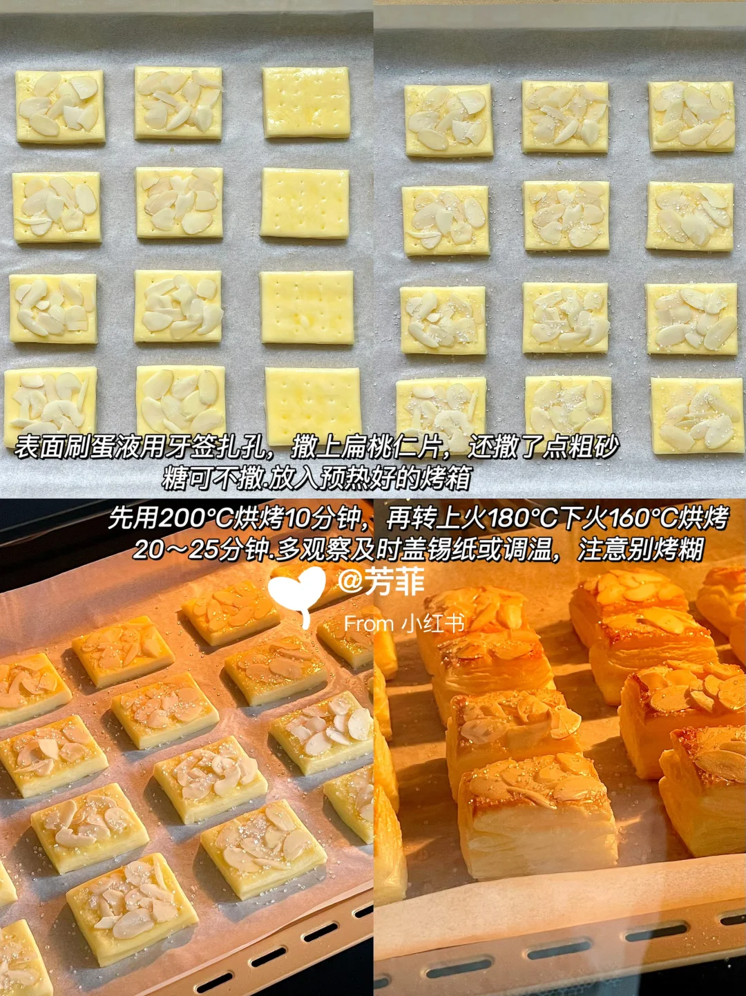 5️⃣摆入烤盘表面刷全蛋液,用牙签扎孔,撒扁桃仁片还撒了点粗砂糖.放入预热好的烤箱,先200℃烘烤10分钟,再转上火180℃下火160℃烘烤18~25分钟.观察上色过早表面需及时盖锡纸,多查看防止烤糊但要烤透才酥⚠️烘烤温度和时间需按自家烤箱温差灵活调节