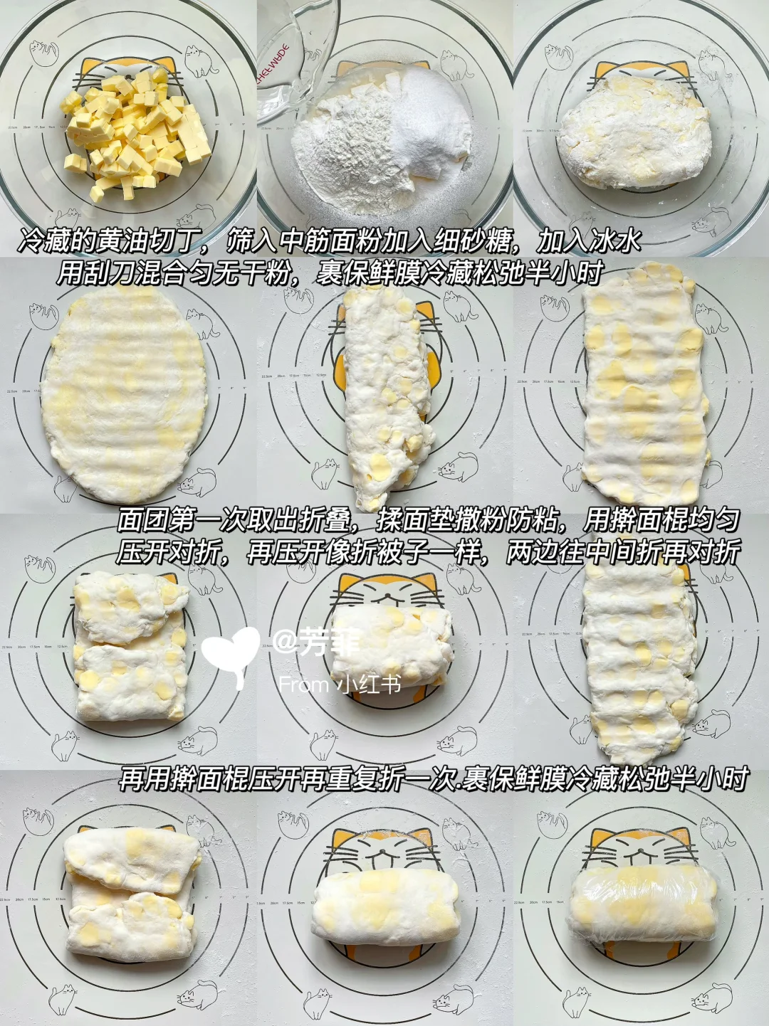 3️⃣面团取出第二次折叠.揉面垫撒粉,同样用擀面棍轻压开,折叠,再压开再四折,重复再压开再四折,一共三次折叠.完成再裹保鲜膜冷藏松弛半小时⚠️前面几次折叠控制面温,速度尽量快点,黄油块保持在半软化状态不能融化成液体,最后一次折叠完再擀开黄油基本均匀布满没有块状