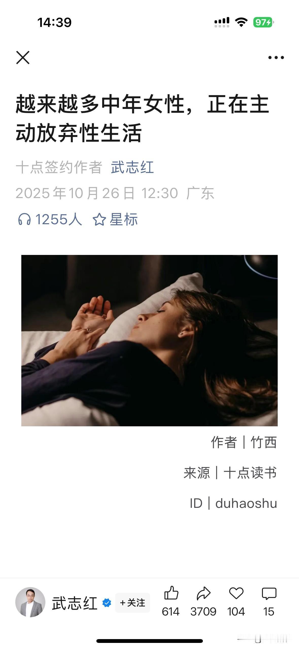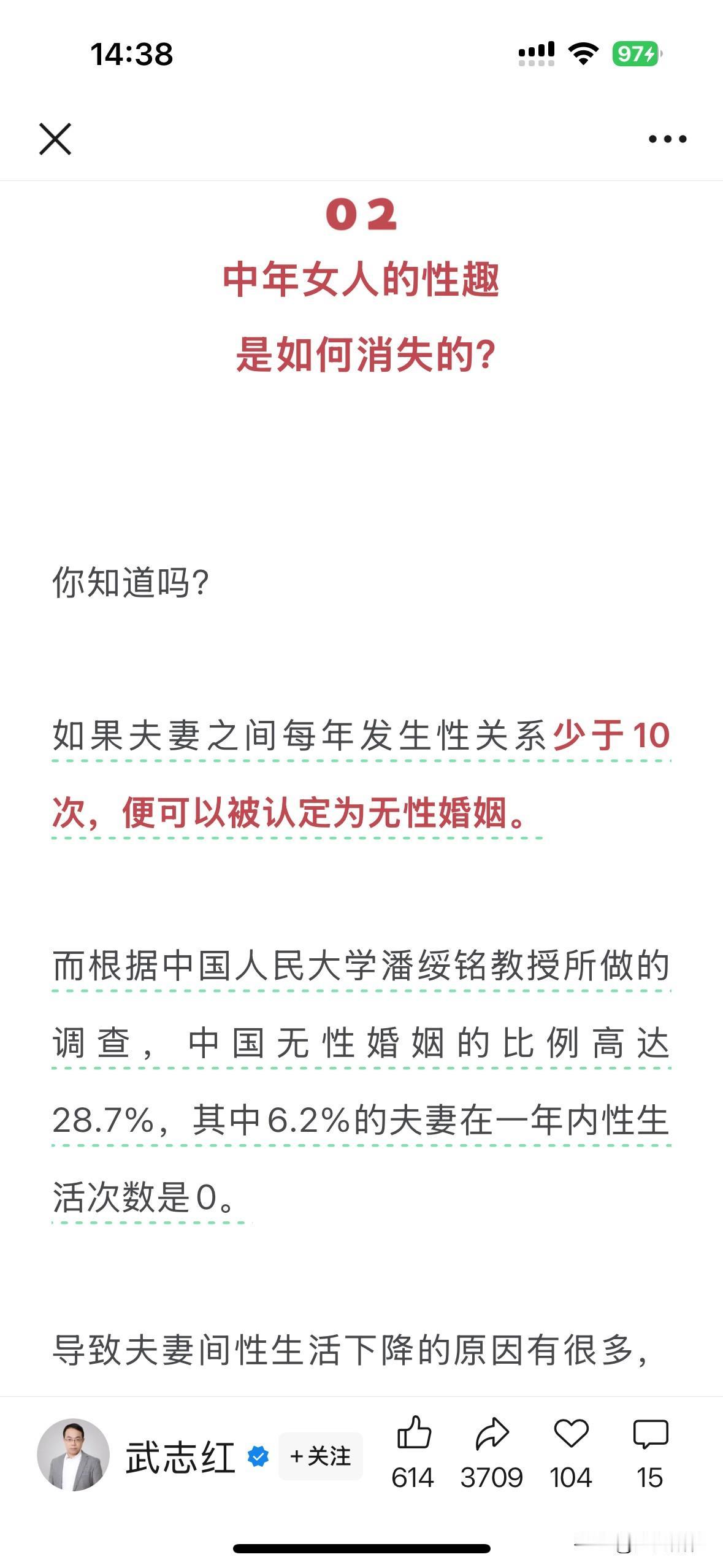 心理专家武志红说越来越多中年女性,正在主动放弃性生活; 如果夫妻之间每年发生性关系少于10次,便可以被认定为无性婚姻。 而根据中国人民大学潘绥铭教授所做的调查,中国无性婚姻的比例高达28.7%,其中6.2%的夫妻在一年内性生活次数是0。 不知道多少中年女性对此会做什么回应。