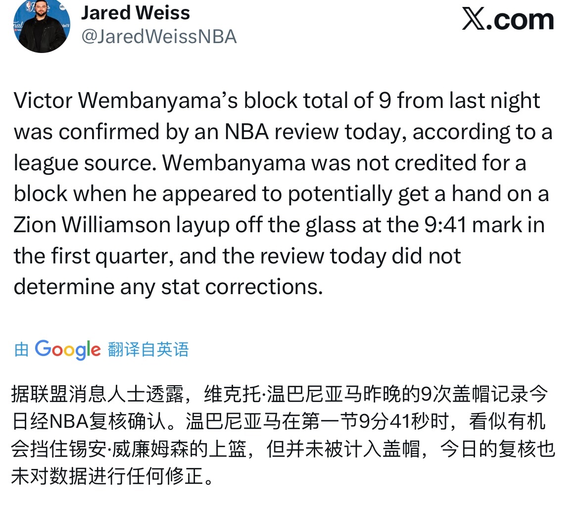 “NBA官方对文班亚马昨天对阵鹈鹕的9次盖帽进行复核,但并未对数据进行修正。”