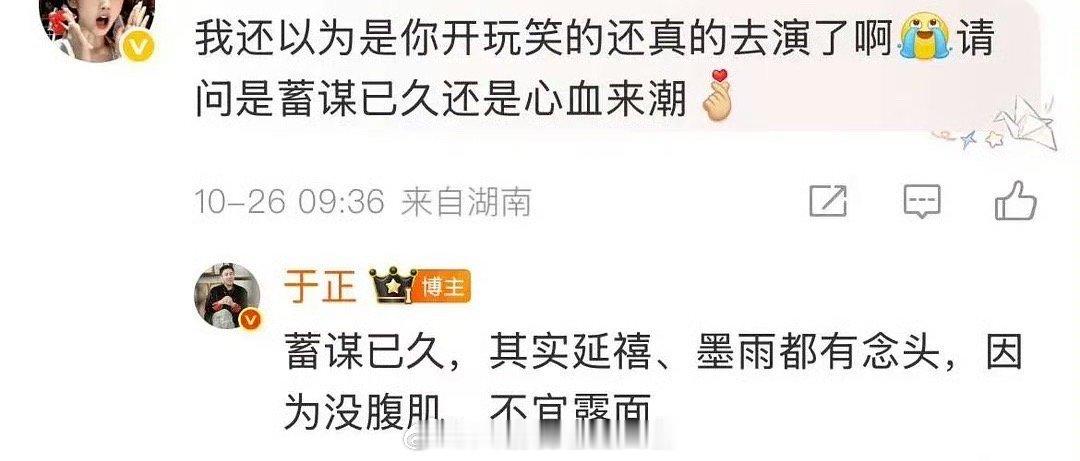 哈哈哈哈哈哈原来于正演戏,是早就想好的事啊!在回应出演电视剧《金吾不禁》的时候,于正说自己早在《延禧攻略》和《墨雨云间》的时候就想演戏了,但是没腹肌不宜露面,话说回来,于正的腹肌是练成了嘛~