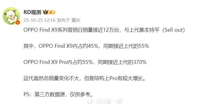 3、OPPO Find X9同比基本上与上代持平,首销日卖了近12万台。Pro版占比为55%;