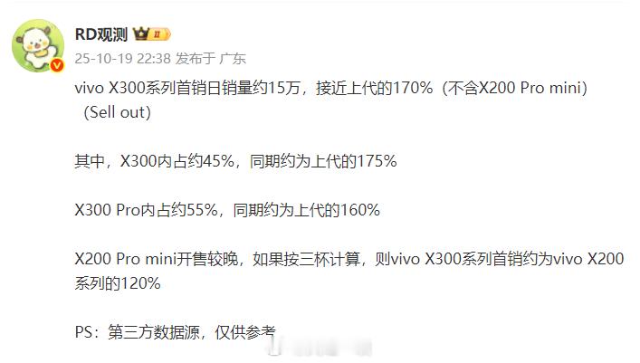 2、vivo X300系列首销日销量接近15万台,同比上一代(如果是两款)增长70%,如果是三款增长20%,其中Pro版占比为55%;