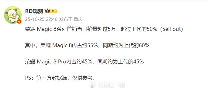 4、荣耀Magic8系列首销日销量接近5万台,同比超过上代的50%,其中Pro版占比为45%。