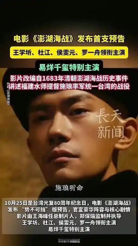 [吃瓜群众]统一台湾,是人心所向、大势所趋,但《澎湖海战》这个电影,要大爆基本是不可能的[思考]毕竟,清朝的“统一”与今日的“统一”,是本质不同的——更何况,宣传海报把易烊千玺的“特别主演”,放在四个“领衔主演”的中间,也是神奇——到底是这个位置,是给易烊的呢?还是给“康麻子”的?