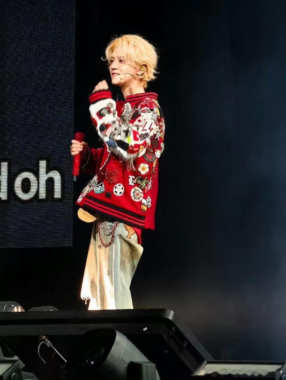 鹿晗香港演唱会鹿晗定制手工拼贴风夹克 鹿晗收官场的定制夹克帅到心巴!红黑底色缀满专属贴布,像把荣耀勋章穿在身上,谁看了不心动啊!