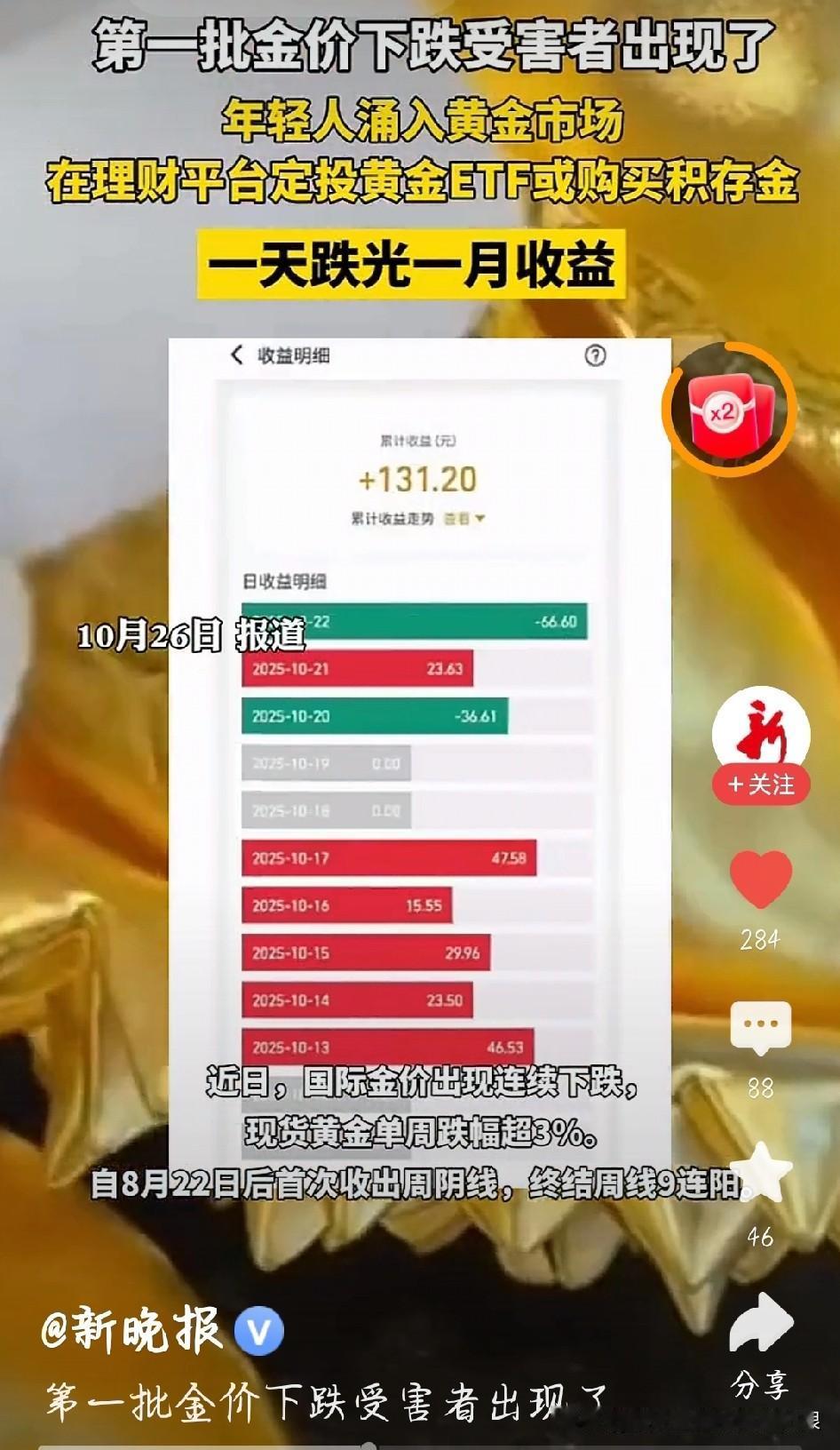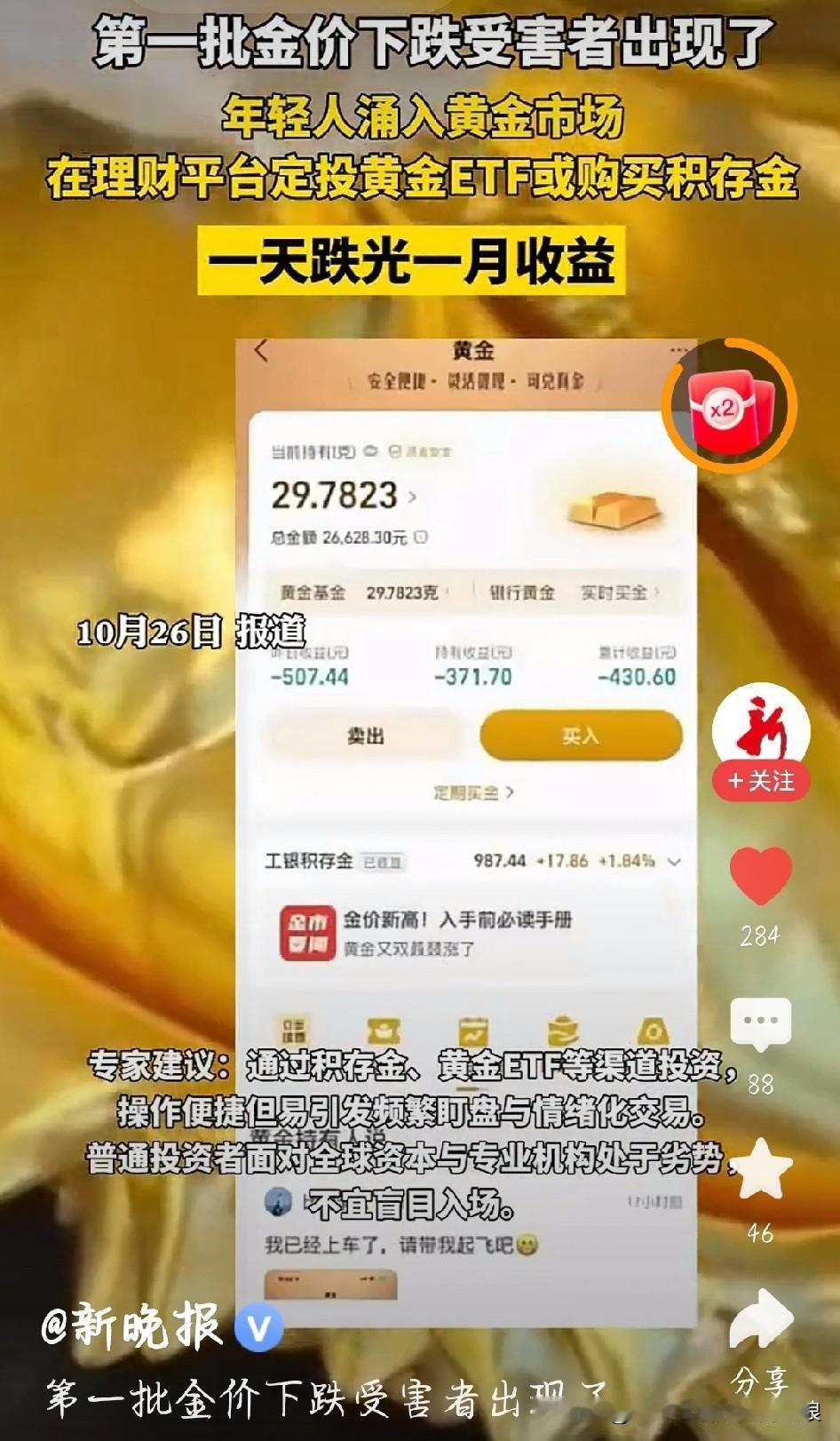 金价跌惨!第一批受害者已经哭了 家人们,金价一跌,不少人直接被套牢了! 杭州有个白领,月薪5000,凑了20万抄底黄金,结果两周就亏了俩月工资。北京还有大学生,投了35万进去,现在三个月生活费都没了。 最冤的是刚需族,郑州张女士刚1236元/克买了三金,现在回收价才950元/克,200克直接亏5万。 之前都喊着黄金稳赚,跟风冲进去的小白太多了。现在周大福、老凤祥金价连着跌,有人想止损,还得被收高额赎回费。这哪是理财,分明是交了智商税!黄金行情价格 金价行情 金价 金价回收行情 实时金价 你对金价的波动有何看法 第一批金价下跌受害者出现了 投资金条金价 黄金价值分析 图片截图于于新晚报