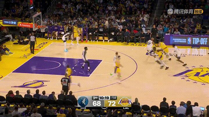 图3,在湖人因包夹/混防出现防守重点在强侧、防线被转移球攻破、森林狼球员(尤其是麦克丹尼尔斯)定点突破/切入直杀篮下时护框,并且保护篮板。