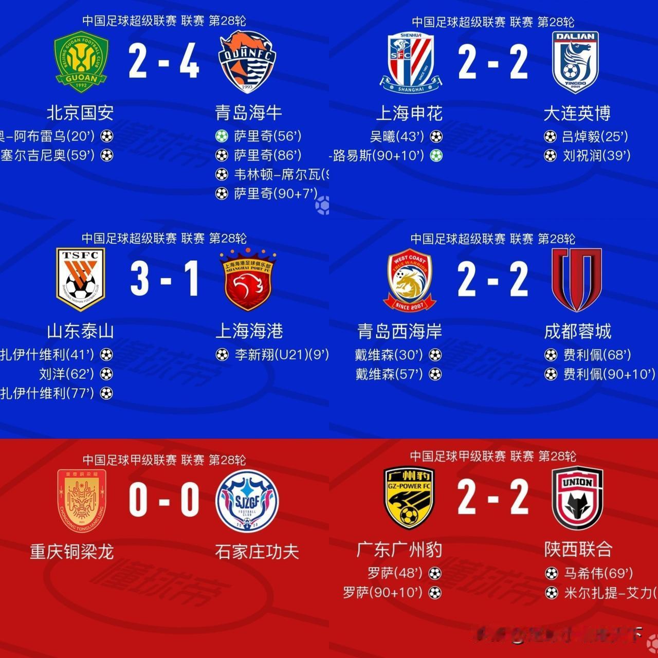 今天的中超和中甲“假”的太离谱了。上港、成都、申花、国安,广州和重庆一个都没赢球。 这轮中超,本来以为上港输球,成都和申花能赢球,没想到这俩全都掉链子。 而保级的海牛居然4:2赢了国安逃离了降级区,真让人没想到。 这轮中甲重庆和广州豹也同时平球。本来以为广州豹这轮会反超重庆,没想到最后差点主场翻车。 其实中超冠军基本就是上港的了,现在就看亚泰、海牛、深圳谁能保级成功了。 最刺激的还是中甲第二支冲超成功的球队。看看重庆和广州谁能笑到最后了。