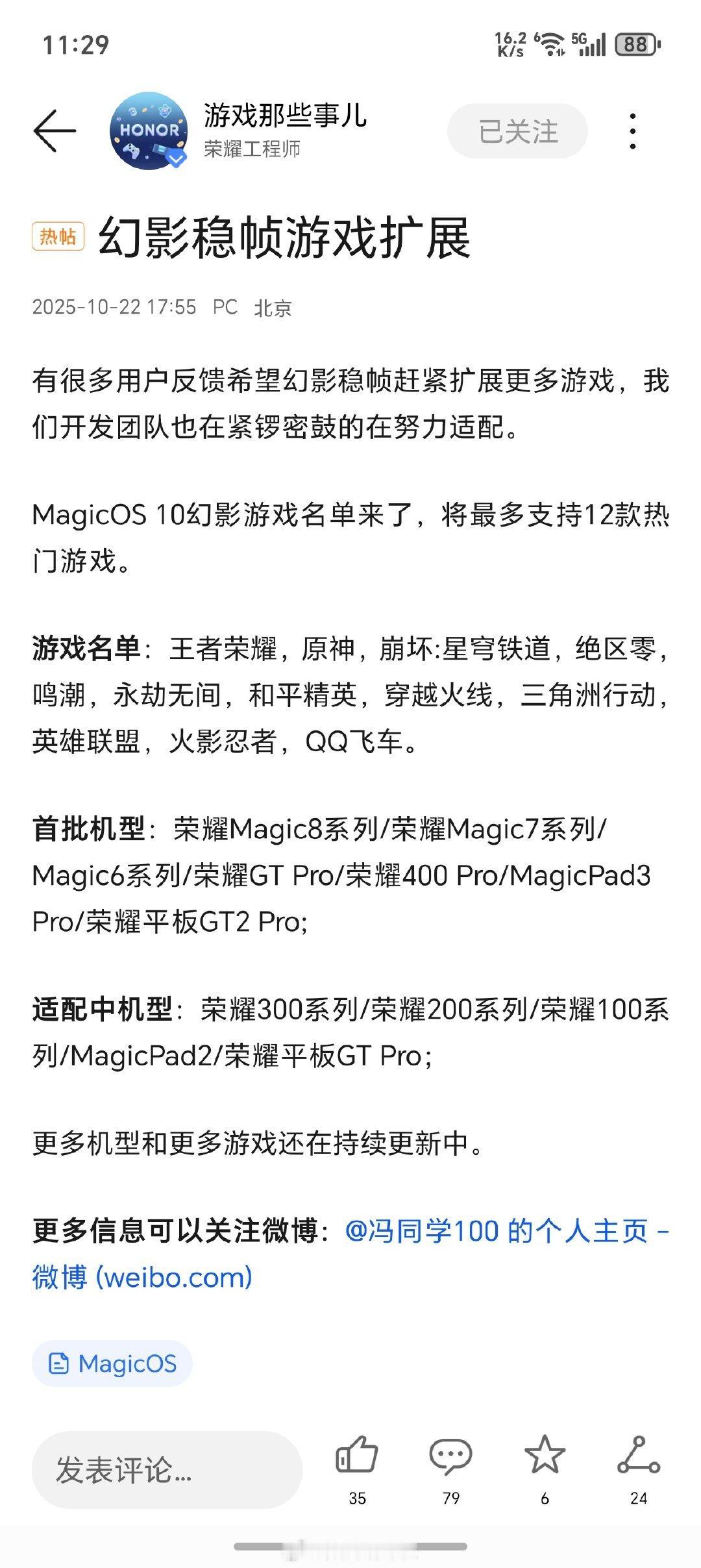 好消息。 荣耀幻影稳帧再下放,新增适配机型荣耀300系列/荣耀200系列/荣耀100系列/MagicPad2/荣耀平板GT Pro。 MagicOS 10幻影稳帧将支持更多热门游戏。游戏名单:王者荣耀,原神,崩坏:星穹铁道,绝区零,鸣潮 ,永劫无间,和平精英,穿越火线,三角洲行动,英雄联盟,火影忍者,QQ飞车。 游戏 科技 万能生活指南