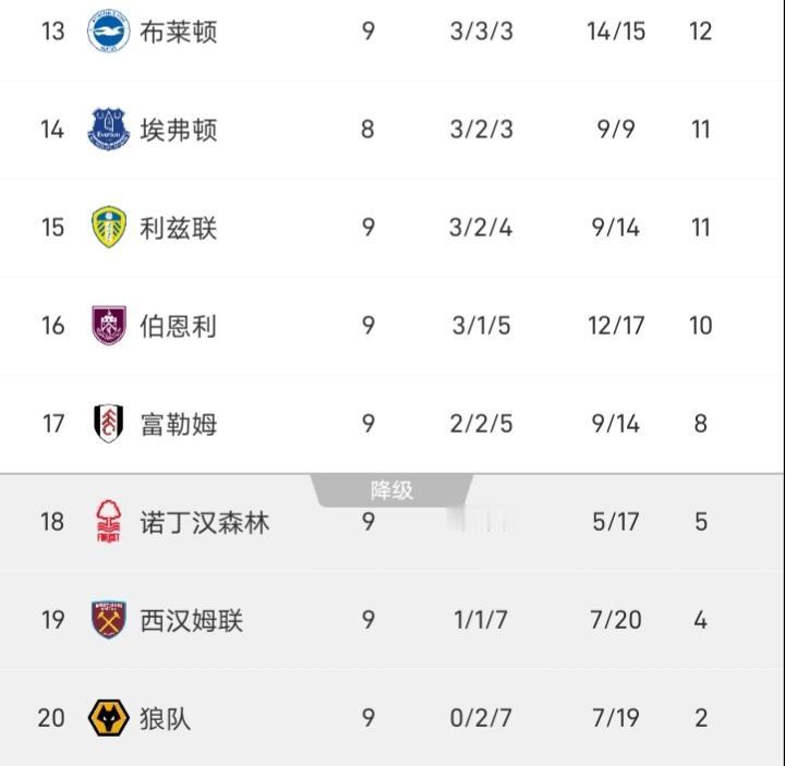 狼队应该锁定一个降级了,9轮过去只拿了2分,本轮又被升班马伯恩利绝杀,狼队已与三支升班马交手都全部输球,就这样狼队还指望从中上游球队手里拿分吗? 狼队在努诺执教时期成绩还是可以的,曾被称为“葡萄牙二队”,但后面狼队也陷入了一年一换主教练的场面,本赛季佩雷拉带队9场不胜,估计也离下课不远了。 当然榜尾的西汉姆、诺丁汉森林都与努诺有关系,努诺曾执教和正在执教的球队都为保级而战,而努诺接手西汉姆联四轮不胜,也不知道俱乐部对努诺的耐性还有多久。