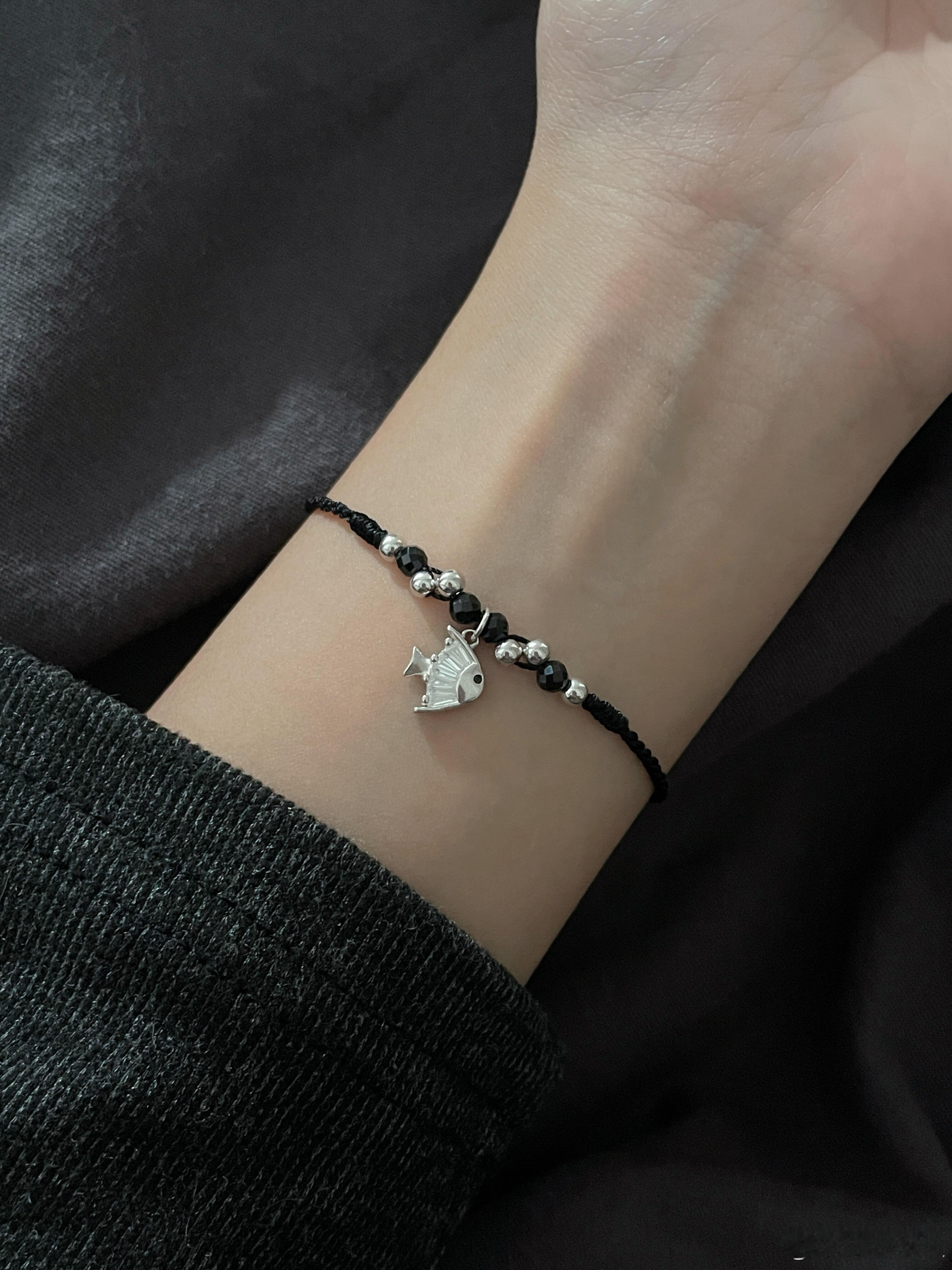 这条黑色编织绳手链以极简设计展现精致感,银色圆珠间隔点缀,形成细腻的韵律美。焦点是尾端悬挂的立体小鱼吊坠——鱼身线条流畅,鳞片刻画清晰,灵动的造型仿佛在水中游弋。深色背景衬托出银饰的闪耀光泽,与白皙手腕形成温柔对比。手链既可单独佩戴彰显低调优雅,也可叠搭其他饰品增添层次。整体设计巧妙融合了自然趣味与现代时尚,是日常搭配中不经意间流露品味的点睛之笔。时尚配饰