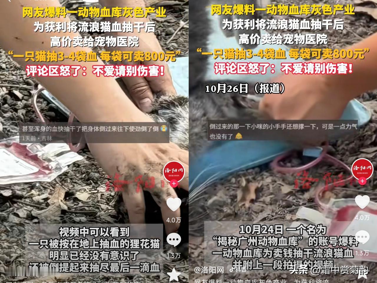 它好不容易给自己喂的胖胖的准备过冬,却被悲魔当成血包榨干最后一滴血 据悉,广州动物血库的流浪猫,为了拯救其他猫咪,悲剧地被榨干一滴血,广州动物血库的流浪猫,被迫成为“移动血袋”。 将“要收养你”成了最残忍的谎言,猫咪被诱骗进笼子后,沦为了反复被抽血的对象。视频里清晰看到,一只母猫抽完血后站都站不住,却还被人抓着再次抽血,最终只能无力地抬了抬爪子,连发出声音、挣脱牢笼的力气都没有了。 2018年就有人见过,三百多只猫关在鸡笼里,瘦得只剩骨头架子!有的刚生完小猫,没几天小猫就死了。这些猫哪是当宠物啊,就是被拿来“榨血”的!抽血的连消毒、麻药都不用,一次抽走半身血,一只猫最多能抽四袋。一袋卖八百,几乎没成本,医院买了就骗主人说是正规捐赠的,谁也不敢查,也没人管这事儿。 这事儿根本不是巧合!国内没有专门管动物抽血的规矩,全靠宠物医院自己定,有些小诊所为了省钱,完全不按正常流程来。网上还有人拍“领养”视频,看着特别暖心,其实是为了抓流浪猫——把猫送去抽血后,再剪成“找到新家”的样子,骗粉丝捐钱。 网上拍猫咪的视频多了去了,可谁也没提那条藏在镜头外的“产业链”——从街边被抓进铁笼,从饿肚子到被抽血,从还有口气到彻底没了动静。 宠物殡葬、猫咖、义卖,看着热热闹闹,可那些没被拍进视频的猫,还在黑屋子里等着冰冷的针头。 涉事的地方没被查封,也没人被抓,猫的血还在接着用,用在别的猫身上,却没人问一句这血到底是从哪来的。 难道流浪猫就应该成为某些人谋利的工具??就应该被这样残忍的对待?对此,你有什么看法,欢迎在评论区讨论