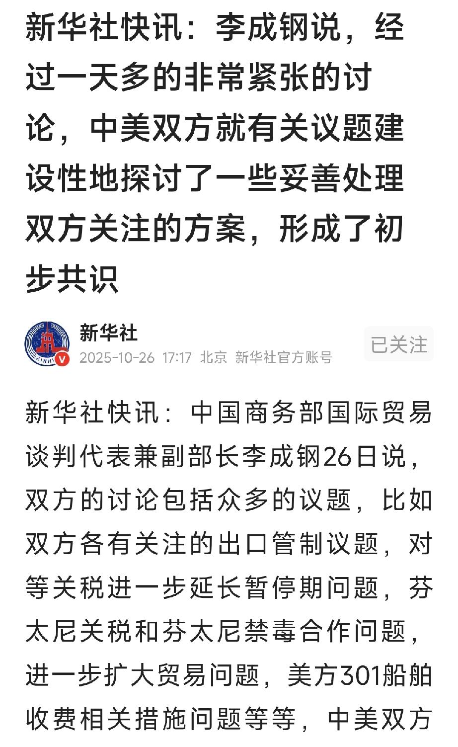 中美第五轮贸易谈判,关税暂停,宣布有建设性进展,取得共识。美方立场强硬,中方维护利益的态度坚定。真不明白这意味着什么,难道是双方都赢了? 这情况有点复杂。从透露的信息看,双方就出口管制、关税延长暂停期等众多议题进行了探讨。 美方立场强硬,可中方维护利益也相当坚定。这并不意味着双方都“赢”了,而是在这场博弈中,谁都不想轻易让步。双方经过紧张讨论形成初步共识,还得履行内部报批程序。这就像两个实力相当的对手过招,谁也无法轻易击倒对方。虽然有争议,但经贸合作关系仍相对稳定,这或许就是这场谈判目前最好的结果,未来走向还得看后续发展。