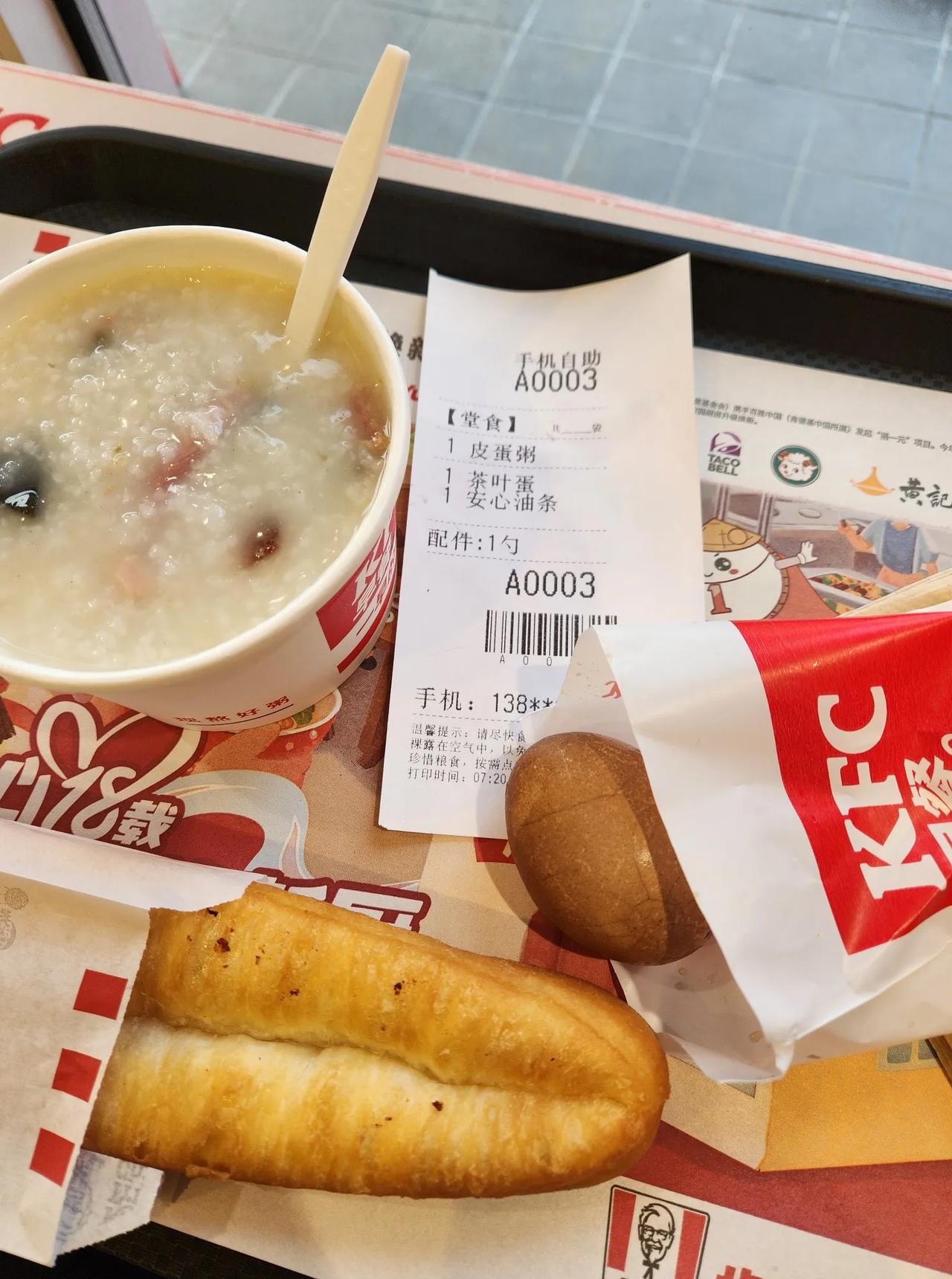 肯德基早餐。 皮蛋粥,茶叶蛋,油条。 典型的南京早餐三件套。 干净卫生环境好。 就是贵。 15元。 没办法,附近就这一家,没有其他早餐店。 你一般早餐吃什么? 早餐攻略 麦当劳早餐 南京早餐