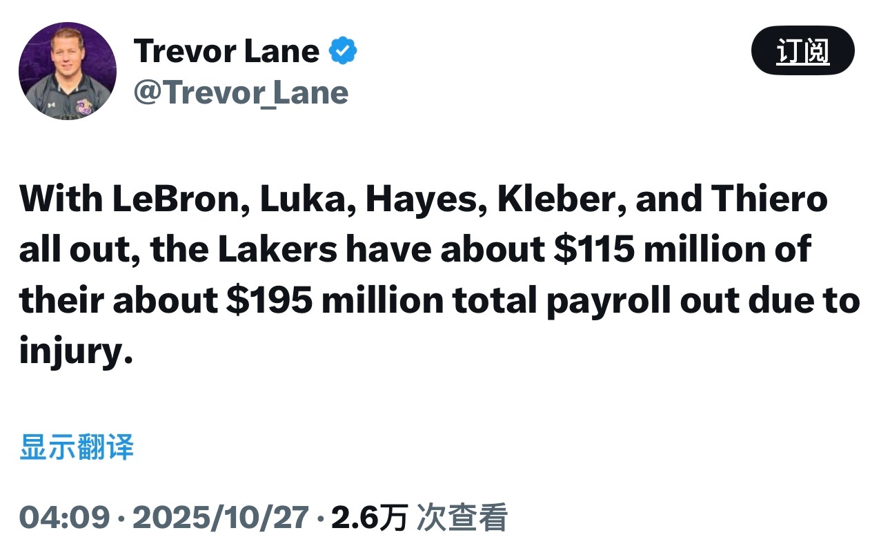 随着詹姆斯、东契奇、海斯、克勒贝尔、蒂耶罗先后受伤,湖人总薪资1.95亿美元中的1.15亿因伤无法比赛。[苦涩]