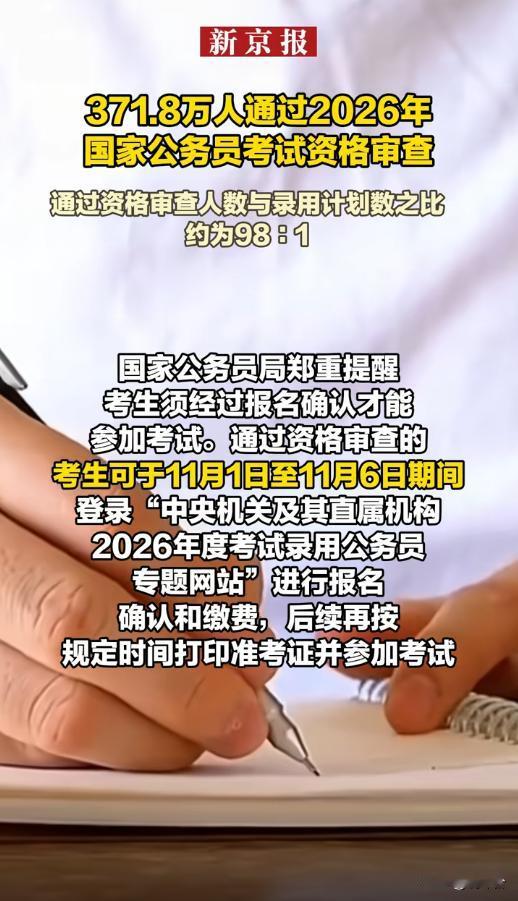 371.8万人争抢国考“入场券”,竞争比98:1创新高 国考热的背后,是年轻人对“稳定”的空前渴望。在不确定性增加的时代,公务员职业的“安全垫”效应被放大。然而,全社会的创新活力需要多元化的人才分布,当最优秀的人才大量涌向体制内,或许我们更应思考如何为年轻人在更广阔的经济领域创造同样有吸引力的“黄金赛道”。国考