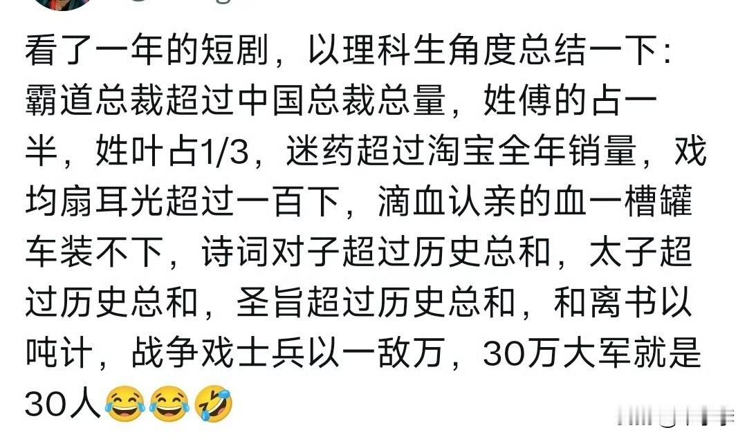 之前看过一个网友评论,说为什么短剧里的霸总都姓傅,搞得她家亲戚都认为她老公是低调的霸总富二代[笑哭][笑哭] 每个短剧都要设立一个脑子寄存处霸总小甜剧 短剧霸总语录