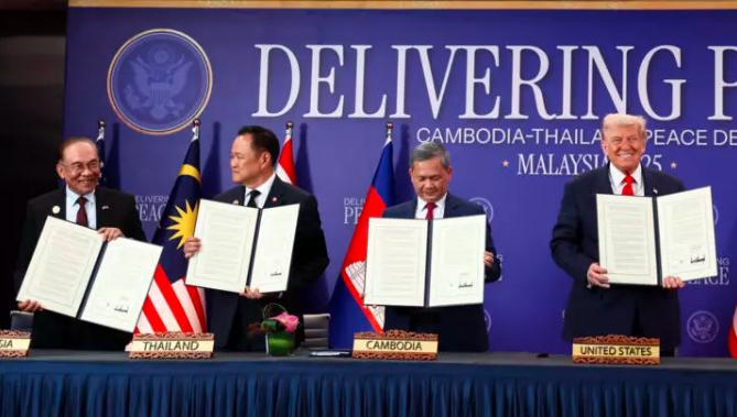 特朗普与马泰柬三国签署贸易和关键矿产协议 并签泰柬停火协议 三国关税 19% 美国总统唐纳德·特朗普周日在吉隆坡与东南亚三个国家签署了一系列贸易和关键矿产协议,并签署了泰柬停火协议。华盛顿正寻求在与中国的贸易战背景下实现供应链多元化。 这位白宫主人正在吉隆坡出席东南亚国家联盟(东盟)峰会,他与泰国、马来西亚和柬埔寨的领导人签署了互惠贸易协议。 根据白宫发布的联合声明,美国将在这些协议框架下,对来自这三个国家的大部分出口产品维持 19% 的关税税率。 唐纳德·特朗普还与泰国和马来西亚签署了协议,旨在实现关键矿产供应链的多样化,以应对北京在这个快速发展的领域中的竞争。 中国作为全球最大的稀土生产和加工国,对其精炼技术实施了越来越严格的出口管制。 因此,各国企业正在寻找其他来源来供应半导体、电动汽车和军事设备等领域所需的关键矿物。 周日,两国在声明中表示:马来西亚同意不对向美国出口关键矿物或稀土元素实施禁令或配额限制。 但该声明未明确马来西亚的承诺是否适用于原始或加工过的稀土。 马来西亚拥有约 1,610 万吨稀土储量,为避免资源流失,该国禁止企业出口稀土原料,同时致力于发展下游产业。 特朗普出席了泰国与柬埔寨停火协议的签署仪式。今年夏天,两国边境发生冲突,造成 40 多人死亡,数十万人流离失所,特朗普协助谈判达成了这项停火协议。 路透社的图片显示:马来西亚总理安瓦尔、泰国总理阿努廷、柬埔寨总理洪玛奈和美国总统特朗普都签署了柬-泰停火协议。 来源:rfi