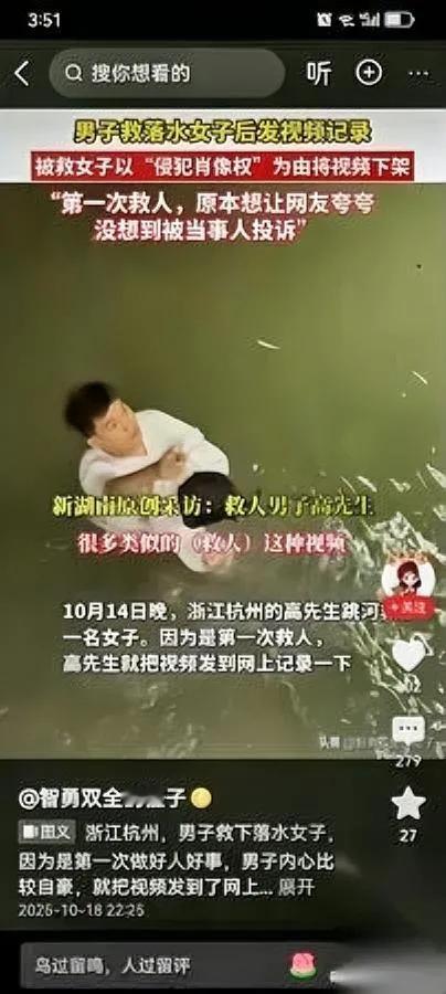 见死不救,为什么? 东莞女司机坠河15分钟,没人拉。 不是心狠,是怕了——之前有个男的救落水女孩,发视频想求句夸,又没露脸又没恶意,结果女孩反过来投诉他侵犯肖像权,连句谢谢都没有!还有次救女人,男的单手抱她胸部借力往上拉,被骂“耍流氓”,合着救人还得先练“标准抱姿”? 不是人心冷,是善意被反咬得太疼了。你帮人一次,被讹一次,下次再遇到事,第一反应不是冲上去,是先想“我会不会被坑”。 女孩们真别做这种“蛇”——等哪天你真掉水里,周围人都在犹豫“救了会不会被告”,那才是真的没人敢拉你。 你说,要是你在场,敢不敢伸手?