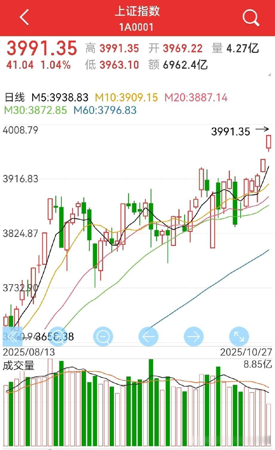 4000点过后,还会涨吗? 红黑线背离,都在跑? 早盘的分时图,红黑线背离严重,这明显又是赚指数不赚的标志… 红黑线背离,说明涨的是权重,而中小微在下跌,或者说不少在怕、在跑。 那么,这种情况下,一般大盘还会上涨。 可能有人会说,这不是见顶信号吗? 嗯,如果是大顶之时,确实是危险信号,但现阶段见大顶了吗? 所以,在早盘卖盘基本结束过后,上午盘的尾盘,又开始上翘,包括黄线,说明还是有人忍不住进场。 老股民上周说过,一定会让踏空的人进来的。[呲牙][呲牙] 当然,接下来也可能会是一个阶段性高点,但估计没那么快,不排除延续到下月初。 边走边看。