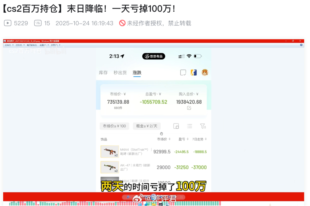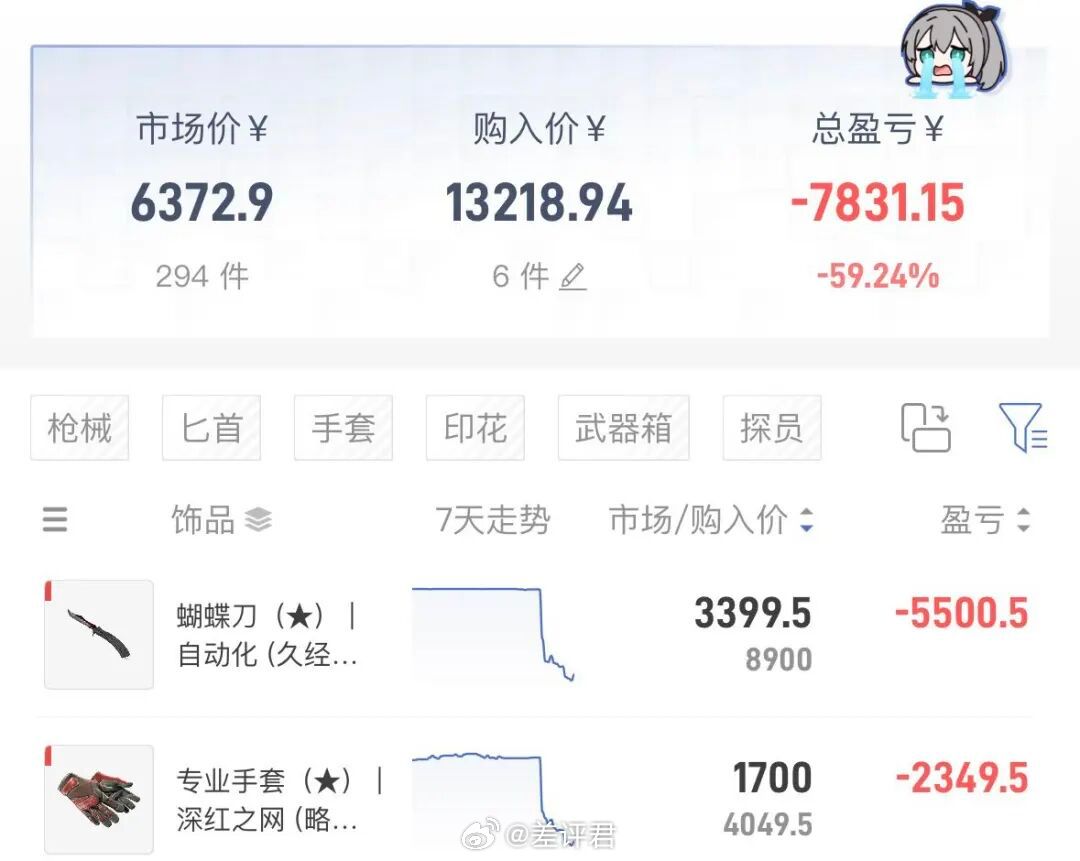 然而这次更新,V社却允许玩家用几个红色品质的饰品,合出刀具或者手套。。。手套和刀具,这些原本几万块钱的东西,一夜之间价格直接腰斩,全民恐慌,人人自危。科创板日报称,CS游戏饰品市场估值从59亿美元暴跌至42亿美元,一日蒸发近20亿美元。