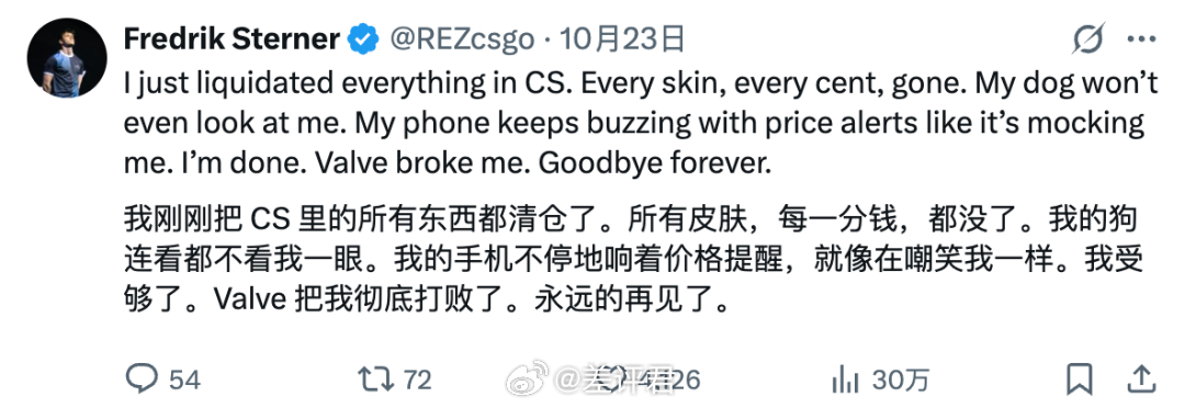 其实,很多人连T+1的股票都玩不明白,怎么对T+14的CS饰品这么自信?更何况这个盘子太小了,不知名的小网红炒作一张垃圾黑蛋贴纸,居然能让这场击鼓传花的游戏唱几个月。陷入疯狂的人们,可能心里想过无数种翻车的方式,但V社这自杀性的大逼兜,还是把大伙整懵逼了。