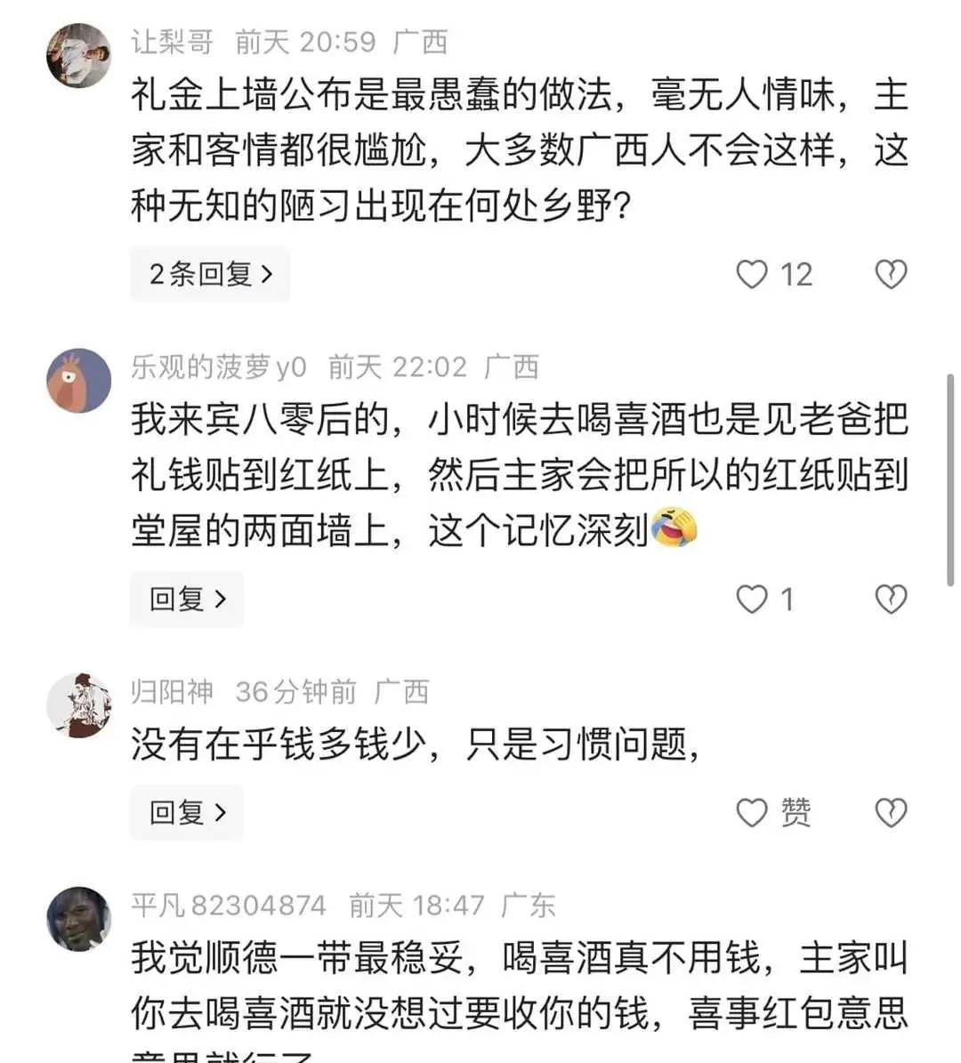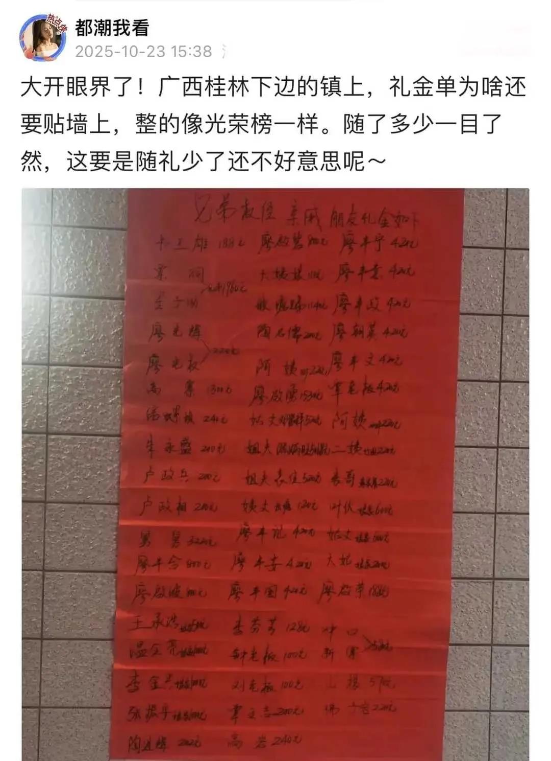 这操作是想打谁的脸?礼金单直接贴墙上,和光荣榜一样!最近桂林乡镇这波操作,真的让人看傻眼。 舅舅随了3220元,最少的有100元,全写在红纸上挂堂屋。网友炸锅了!有人说这陋习太伤感情,也有人反驳广西都这样,随礼是心意,不是攀比。 公开礼单本意如果是为公平,可当面子绑住人情,轻松的心意反倒变了味。