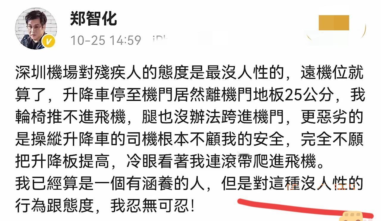 之前看了郑智化批深圳机场帖子,我还真以为他是勿勿忙忙、连滚带爬上的飞机,后来看别人发的现场视频,才发现他有些言过其实,反而觉得深圳机场的致歉有点看人下菜碟——因为郑的明星身份。 这事越扒越清楚,哪是什么机场服务失职,分明是一场被情绪放大的“误会”,背后藏着的“明星特权”争议才更值得说道。 升降车司机按规章操作,没把平台升满是为了保护飞机,本身一点错没有;现场工作人员还主动上前搀扶,早就把所谓的“不便”补回来了。郑智化提问题是权利,但把正常流程说成“连滚带爬”,难免有点夸大其词,带着明星的情绪滤镜放大了不满。 更让人不舒服的是机场的致歉,要是普通乘客遇到这事,大概率不会有这样的“特殊待遇”。这种看身份下菜碟的态度,反而比事件本身更刺眼——公共服务该讲规则公平,不是谁名气大谁就有特权,更不该用道歉去迎合情绪,寒了遵守规则的人的心。 说到底,这事最该反思的不是按规办事的司机,而是不分情况的“明星特权思维”。你觉得公共服务该给明星特殊对待吗?来评论区聊聊~