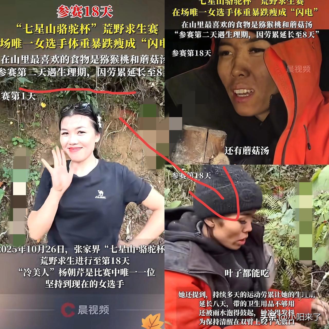这下出名了 不仅荒野求生,全国网友都知道了 荒野求生唯一的女选手仅仅18天已经瘦脱了相,我看视频时心都揪成一团! 还记得她刚上节目时,画着精致淡妆,笑起来眼里有光,说要冲刺20天拿奖金,那股子自信劲儿谁看了不夸句元气 ! 可别觉得她是来“划水”的,人家是所有选手里头一个钻木取火成功的女生! 跪在糙石头地上,攥着木棍搓了整整五小时,直到火星冒出来时,手都抖得快握不住东西,这份韧劲儿比不少男选手都强 ! 偏偏老天不饶人,取火成功第二天就撞上生理期,户外风餐露宿、高强度求生,直接把经期拖到了八天,没热水、没暖贴,光想想都替她疼 ! 现在就差2天能拿6000块奖金,评论区有人喊“再撑撑就赢了”,但我真觉得没必要! 这钱是能解燃眉之急,可身体要是垮了,后续花的钱、遭的罪,哪是6000块能补回来的?比起硬扛到拿奖金,平安健康地走出荒野才是真的赢 ! ​你们觉得呢?