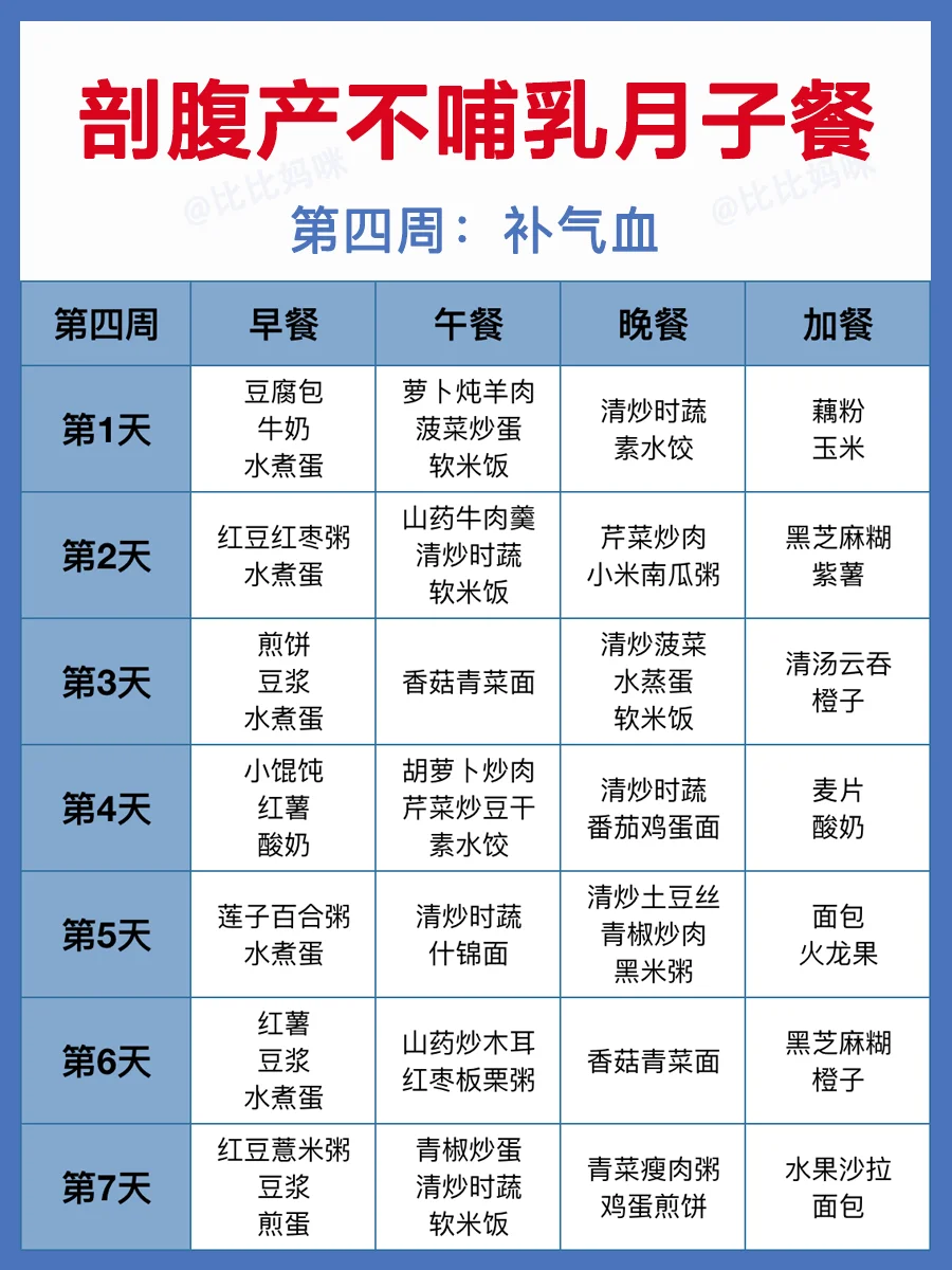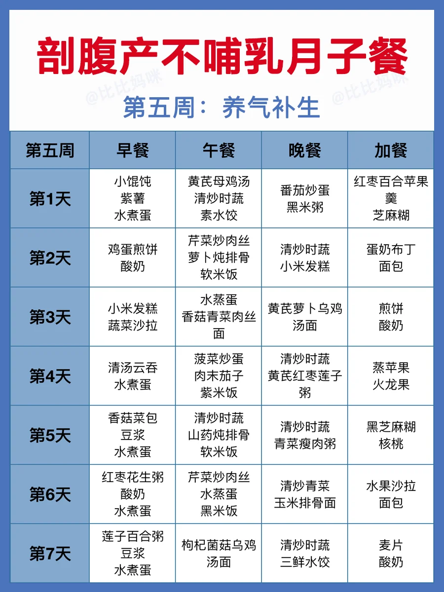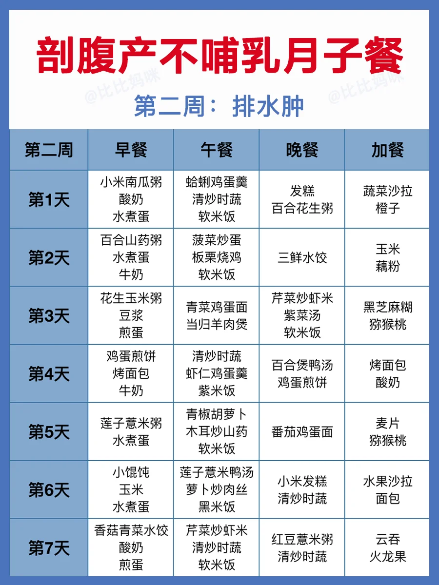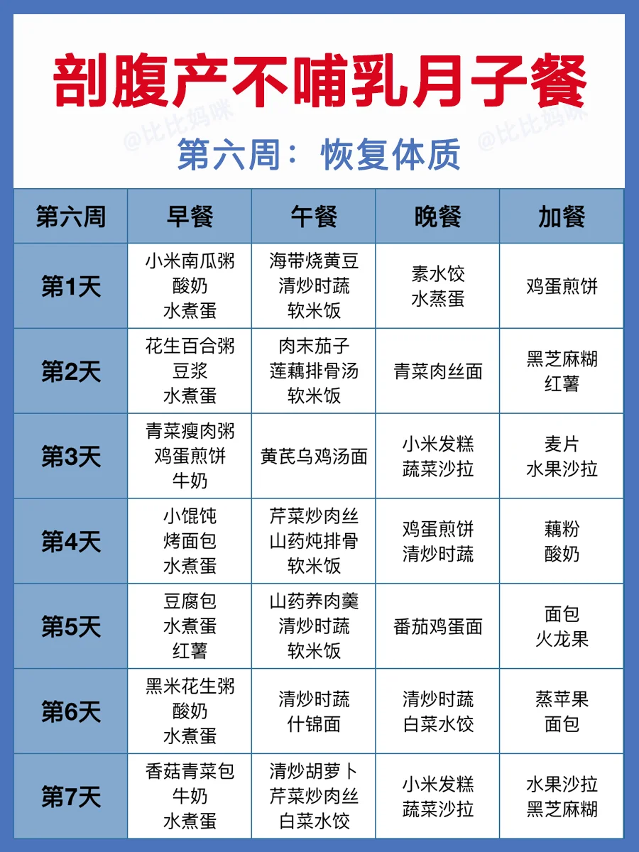 即将坐月子的孕妈妈看过来,特别是打算不请月嫂在家坐月子的姐妹,收好这份剖腹产不哺乳42天月子餐食谱,直接打印出来抄作业,不用再纠结月子餐吃什么了,都帮准妈妈们整理好啦~愿所有姐妹都能安心坐月子 · ⭕️本文内容包括: ✅剖腹产不哺乳第一周月子餐:排气排恶露 ✅剖腹产不哺乳第二周月子餐:排水肿 ✅剖腹产不哺乳第三周月子餐:催乳 ✅剖腹产不哺乳第四周月子餐:补气血 ✅剖腹产不哺乳第五周月子餐:养气补生 ✅剖腹产不哺乳第六周月子餐:体质恢复