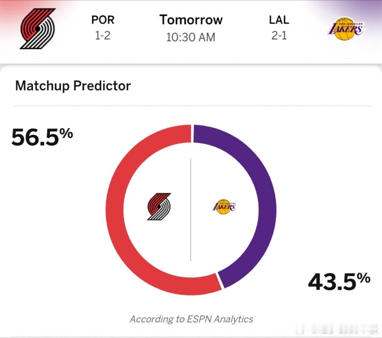 当前ESPN预测胜率:开拓者56.5%,湖人43.5%新赛季篮不住
