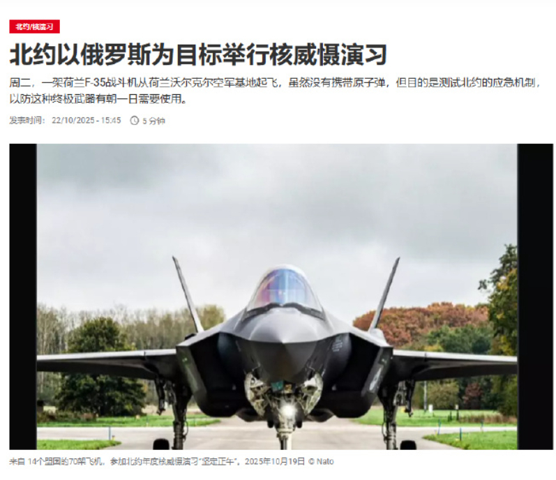 面对俄罗斯的强硬动作,北约这边立刻“针锋相对”。也是在10月22日,也就是普京下令演习的同一天,北约宣布启动“坚定正午”(Steadfast Noon)年度核威慑演习。