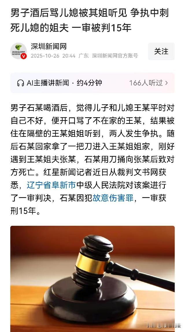 辽宁阜新,石某醉酒后在家骂儿媳,结果被住在隔壁的儿媳的姐姐听见了,两人吵了一架,石某回家拿了把刀冲到儿媳姐姐家捅死了儿媳的姐夫,法院这样判。 据深圳新闻网、裁判文书网等报道,男子石某脾气暴躁,嘴巴说话毒,还爱喝酒,一喝起酒来就不知天高地厚,逮着谁骂谁。 因为石某的这种种毛病,附近的邻居都不太待见他,就连他的儿子儿媳都不喜欢他。 好在石某的儿媳妇王某的姐姐住在石某家隔壁,平时没事干的时候,石某经常去王某姐姐家串门。 念在两家是亲戚的份上,王某姐姐虽然也不喜欢石某,到一直都是笑脸相迎。 去年8月的一天中午,石某的儿子和儿媳不在家,石某自己一个人在家炒了个菜,喝起了闷酒。 三杯酒下肚,石某心里越来越郁闷,一不留神就喝多了。 石某觉得,自己费心费力把儿子养大成人,儿子却只听媳妇的话不孝顺他,这一切都是儿媳妇王某造成的。 趁着儿媳妇不在家,石某借着酒劲走到门口,对儿媳妇破口大骂起来。 王某的姐姐正好在家,听见石某骂自己妹妹骂得这么难听,立即走出来质问石某,两人一言不合吵了起来。 石某觉得自己是长辈,王某姐姐作为晚辈竟然敢这么对自己说话,自己威严何在? 气不过的石某立即返回家里,拿了一把洋镐和一把刀,找到儿媳姐姐家找她算账。两个人再次吵了起来,争吵间,王某的姐夫张某回来了。 张某见石某跑到自己家找自己老婆吵架,骂人还骂得那么难听,立即推了石某几下,让他离开自己家。 谁知石某却动了怒,拿刀对着张某左腹部就是一下。张某倒地不起,石某离开回了自己家。 回家后,石某给女儿发信息说自己捅了张某,要去派出所,随后石某将刀放在三轮车上,骑着三轮车出门。 不大会,接到报警的民警将石某的三轮车别停,并将石某控制了起来。 与此同时,王某的姐夫张某被送去救治,可最终还是因失血性休克离世。 那么,本案从法律角度应该如何认定?石某会受到什么处罚? 很明显,石某的行为构成了故意伤害罪。 石某醉酒后在门口辱骂儿媳,这种行为本身虽不构成严重的刑事犯罪,但反映出其不良的行为习惯和冲动的性格特点。 随后,石某与儿媳姐姐发生争吵,在争吵后石某回家拿了洋镐和刀,前往儿媳姐姐家。 此时,石某的主观故意已逐渐形成,他带着凶器前往他人住所,明显有伤害他人的意图。 当王某的姐夫张某回来,推搡石某让其离开时,石某被激怒,拿刀捅向张某左腹部,导致张某最终因失血性休克离世。 从犯罪构成要件来看,石某作为具有刑事责任能力的成年人,符合故意伤害罪的主体条件。 根据《刑法》规定,已满十六周岁的人犯罪,应当负刑事责任。 石某显然具备承担刑事责任的年龄和能力。 犯罪主观方面,石某具有伤害他人的故意。 石某在与儿媳姐姐争吵后回家取刀,又前往对方家中,在与张某发生冲突时,直接用刀捅向张某。 这一系列行为表明石某明知自己的行为会对张某的身体造成伤害,并且积极追求这种结果的发生,属于直接故意。 再者,石某的行为侵犯了张某的身体健康权和生命权。 故意伤害罪侵犯的客体是他人的身体健康权,石某的行为直接导致张某身体受到严重伤害,并最终失去生命,严重侵害了张某的身体健康权。 最后,在犯罪客观方面,石某实施了捅刺张某的行为,并且该行为与张某的死亡结果之间存在直接的因果关系,清晰地展现了犯罪行为与危害结果之间的紧密联系。 依据《刑法》第二百三十四条规定,故意伤害他人身体的,致人死亡或者以特别残忍手段致人重伤造成严重残疾的,处十年以上有期徒刑、无期徒刑或者死刑 。 石某故意伤害张某并导致张某死 亡,应在10年以上有期徒刑以上范围量刑。 一审认为,石某并非第一次犯罪,此前他就有过相同犯罪前科,应从重处罚。 但是,案发后,石某给女儿发信息说自己捅了人要去派出所,随后骑着三轮车出门,应该视为主动投案。 到案后,石某主动交代、如实供述犯罪过程,并签了认罪认罚具结书,应视为投案自首,行从轻处罚。 另外,本案是因亲属之间琐事引起,石某和张某平时关系很好,石某是激情犯罪,主观恶性较小。 因此,综合考量,一审判石某犯故意伤害罪,判处其期徒刑15年。 根据《民法典》第一千一百七十九条规定,侵害他人造成人身损害的,应当赔偿医疗费、护理费、交通费、营养费、住院伙食补助费等为治疗和康复支出的合理费用,以及因误工减少的收入。造成残疾的,还应当赔偿辅助器具费和残疾赔偿金;造成死亡的,还应当赔偿丧葬费和死亡赔偿金。 因此,判石某赔偿附带民事诉讼张某家属经济损失49866.5元。