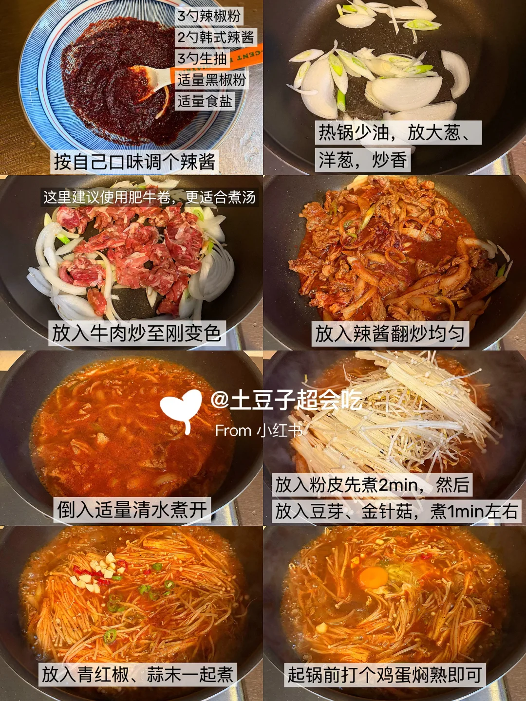 🌶️ 主要食材:肥牛/牛肉、洋葱、粉皮、金针菇、豆芽、鸡蛋、大葱/青红椒/大蒜
