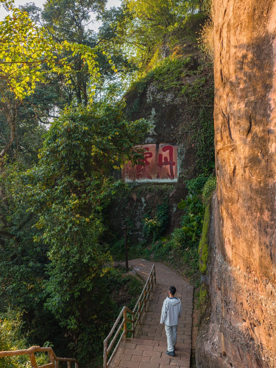 路线:中山门-丹霞山索道-舵石-韶音亭-观日亭-丹梯铁索-别传禅寺-摩崖石刻-锦石岩寺-翔龙湖码头上船-阴元石-翔龙湖龙尾码头出,步行至长老峰码头-乘坐水上丹霞游船-阳元码头下船-阳元石-九九天梯-万古丹霞实景光影秀