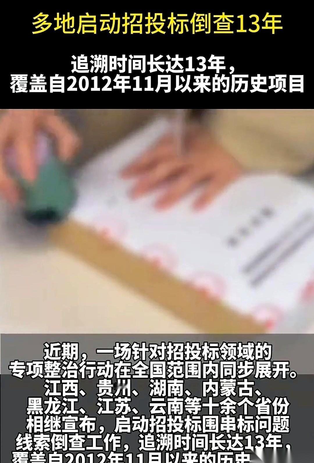 倒查13年。 就这四个字,我看到的时候,后背都麻了一下。 2012年11月之后的所有招投标项目,一个都跑不掉。这不是检查,这是考古啊朋友们。 那些当年靠着“关系”和“手段”拿了项目,以为早就过了追诉期,账本都发霉了的老油条们,估计现在晚上都睡不着觉了。 想想都觉得刺激。 工程建设、政府采购、国企采购……哪个不是油水厚得流油的地方? 以前总听人说,这行水深。怎么个深法?就是几家公司凑在一起演戏,把价格抬上天;就是某个领导打个招呼,标书做得再烂也能中;就是项目到手,转包分包,层层扒皮,最后落地一堆豆腐渣。 左手倒右手,国家的钱、我们纳税人的钱,就这么进了私人的口袋。 现在好了,不玩虚的了。 从招标准备、投标评标,到最后履约,每一个环节,每一个签字,都要给你翻出来,放在显微镜下看。 而且你看,江西、内蒙古这些地方,线索征集直接开到2026年底。 这什么意思? 这不是一阵风,刮过去就算了。这是要彻底把这个圈子里的生态给它换一遍,把那些见不得光的潜规则,连根拔起。 说白了,就是要把那些年里,本该属于阳光下的东西,从阴暗的角落里,一件一件,全给它掏出来,晒个明明白白。 挺好的。真的。 这股清流,希望能冲刷得再干净一点。