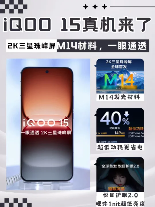 💯当然,iQOO 15最让人惊喜的非2K三星珠峰屏莫属。顶级的三星M14发光材料,真·2K分辨率显示效果清晰通透,色彩和色准表现都非常优秀。同时,功耗表现非常优异,甚至比1.5K分辨率的果子16超大杯能低40%,也为iQOO 15带来更持久的续航。再加上悦目护眼2.0和硬件1nit超低亮度,长时间使用眼睛也不会难受。