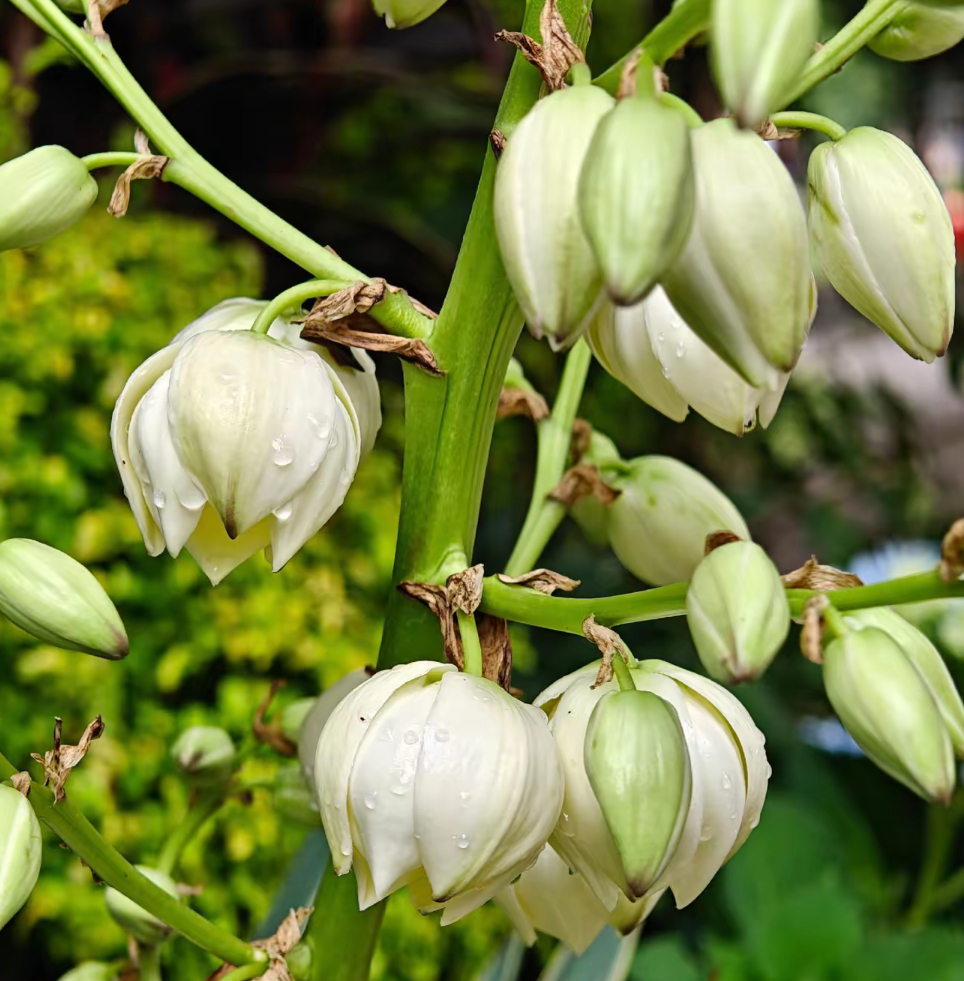 ▪️ 圆锥花序呈烛台状挺立,花葶高大粗壮,洁白花朵下垂如杯,花瓣温润素雅,花期8-10月,盛花时满枝芬芳~